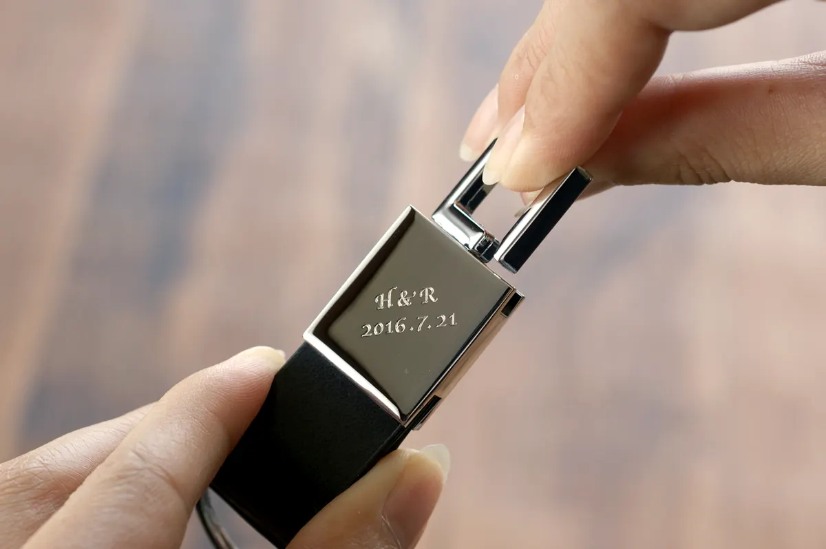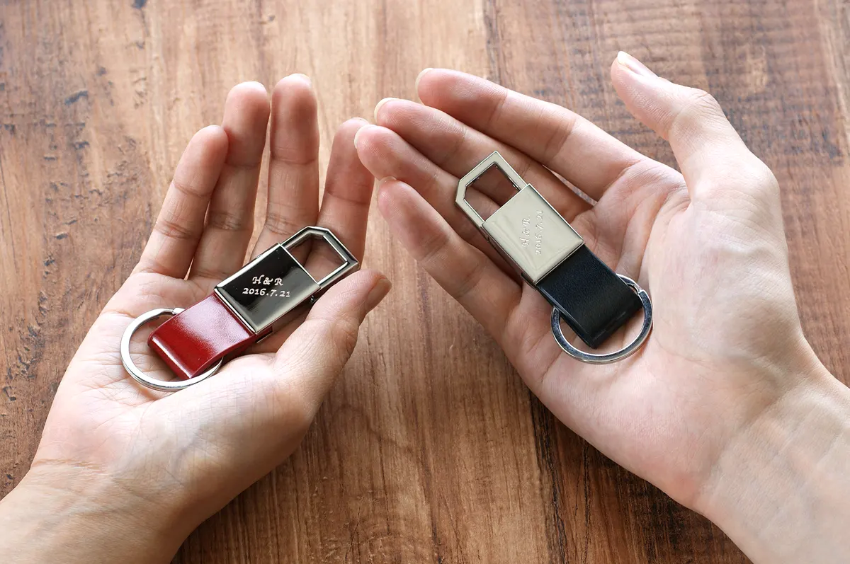 パートナーとおそろいで持つなら、さりげなく持てるペアキーホルダーを。グロッシーなメタルと牛革のバランスが大人カップルにぴったりなデザインです。コーデの中でもあまり目立たないキーホルダーなら、ペアアクセが苦手な彼も気兼ねなく日常使いできるはず。選べるカラーは全5色で、同じ色でおそろいにも、色違いにもできます。