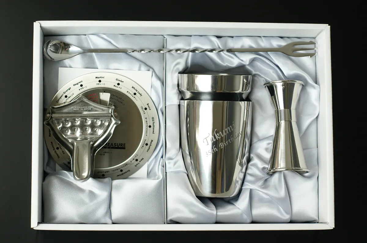 カクテル作りに必須の5点がセットになりました。シェイカーの容量はちょい飲みにぴったりな250ml。細かいところまで丁寧に仕上げられた、安心の日本製です。