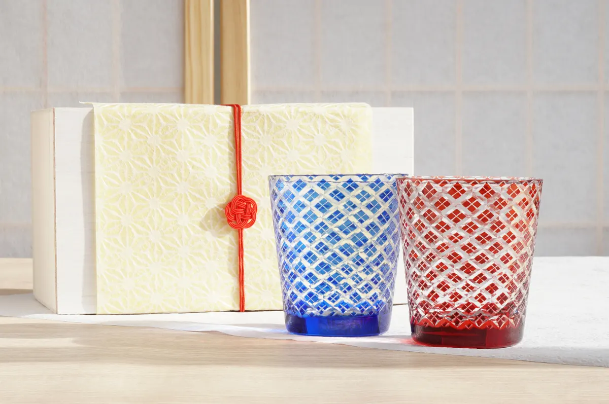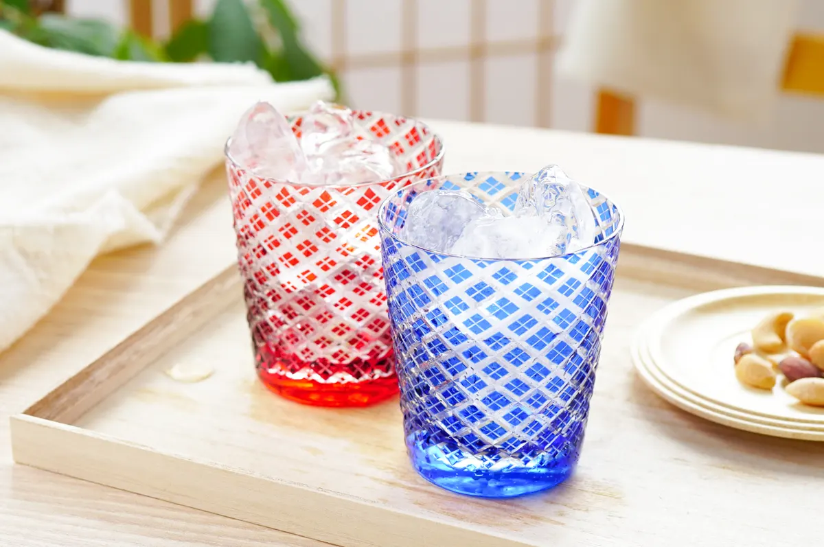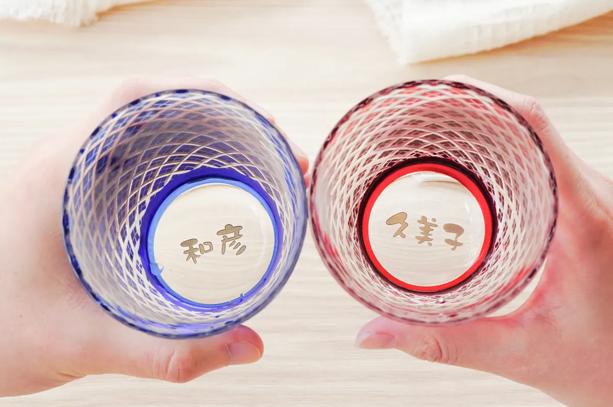 晩酌タイムは一緒に楽しむ、というおふたりにはこちらもおすすめ。レッドとブルーのペアグラスです。容量は約220mlと、お酒は好きだけとそんなに強くないという方にもちょうどいいサイズ。名入れ彫刻のフォントがやわらかい雰囲気なので、女性でも使いやすいのがポイントです。