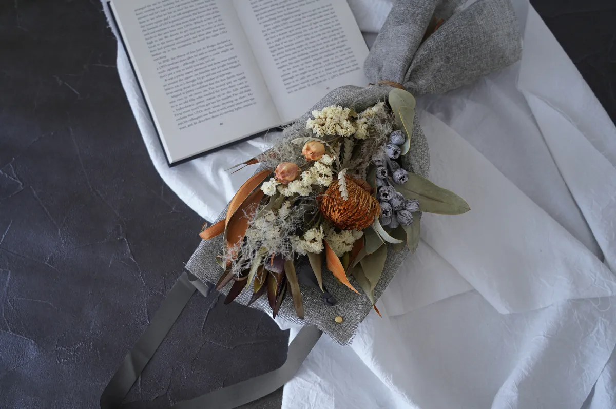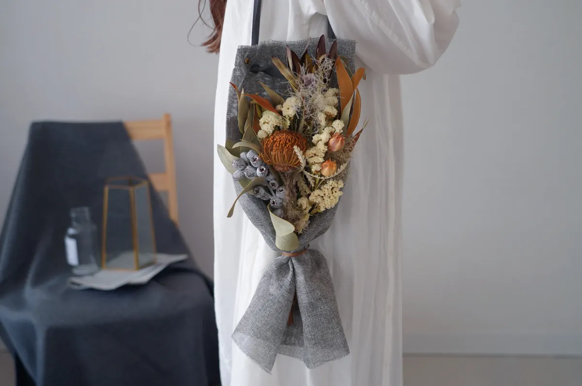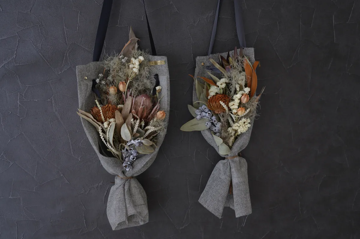 バック風にアレンジしたドライフラワーのブーケ。