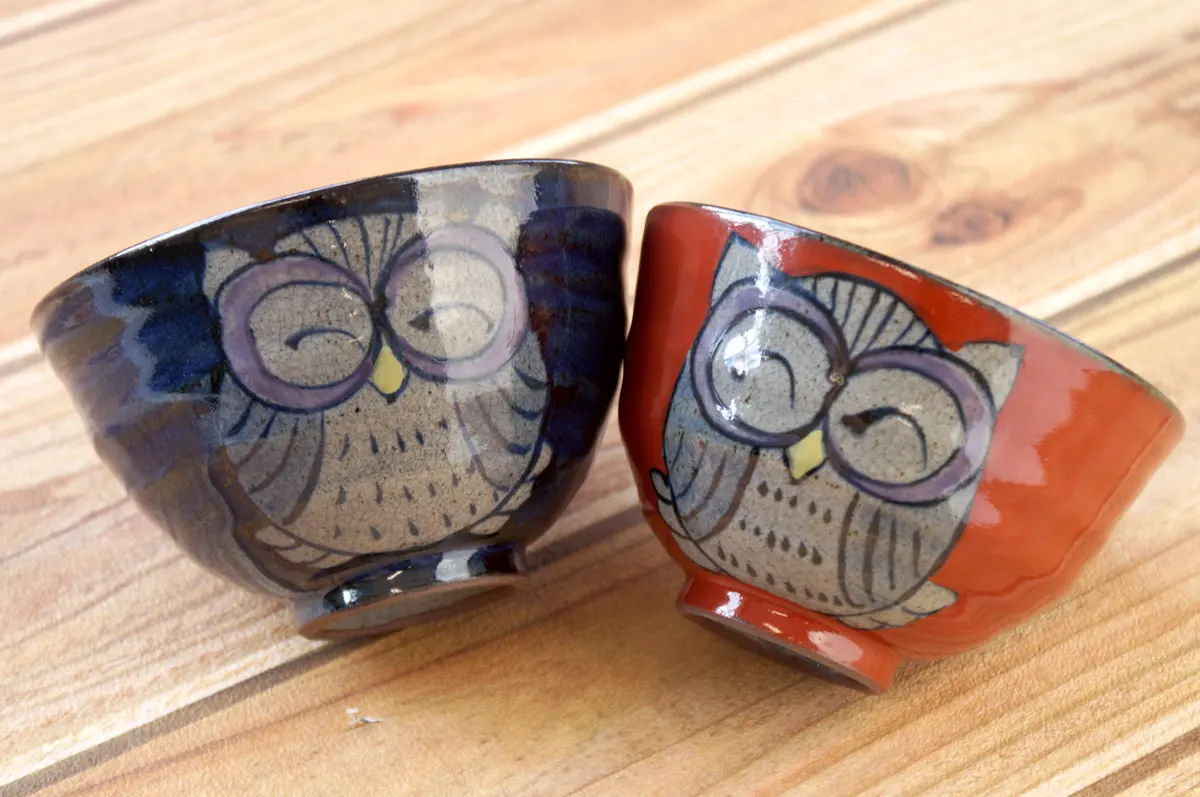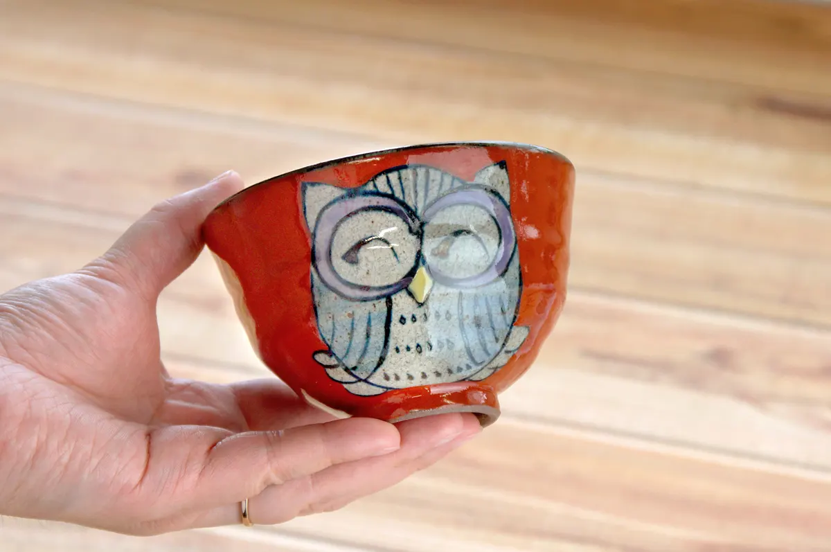 大きく描かれたにっこり笑顔のふくろうが目を引きます。手描きならではの個性ある表情が楽しいお茶碗です。貫入(かんにゅう)と呼ばれる細かなヒビをあえて入れて風合いを出す技法が使われており、見た目にもさわり心地にもあたたかみを感じられます。
