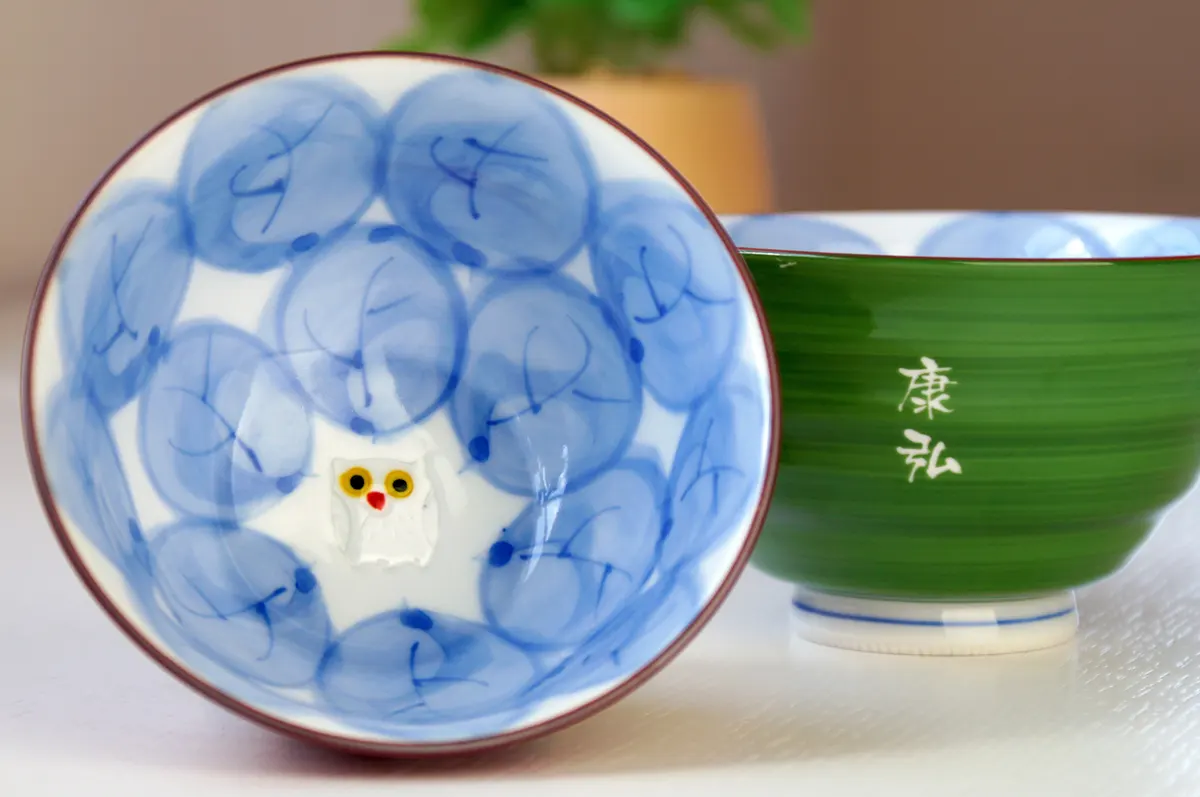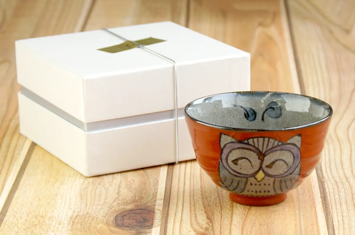 底に描かれたふくろうの絵付けは一点一点職人の手作業によるもの。ギフトボックスは引き出物にも用いられる丈夫な「インロー式」なので、きちんとしたお祝いにも安心です。ご飯を食べ終えるたび、底のふくろうと目が合いほっこり。
