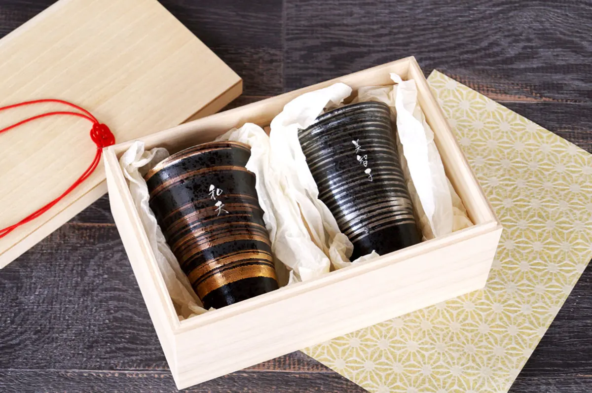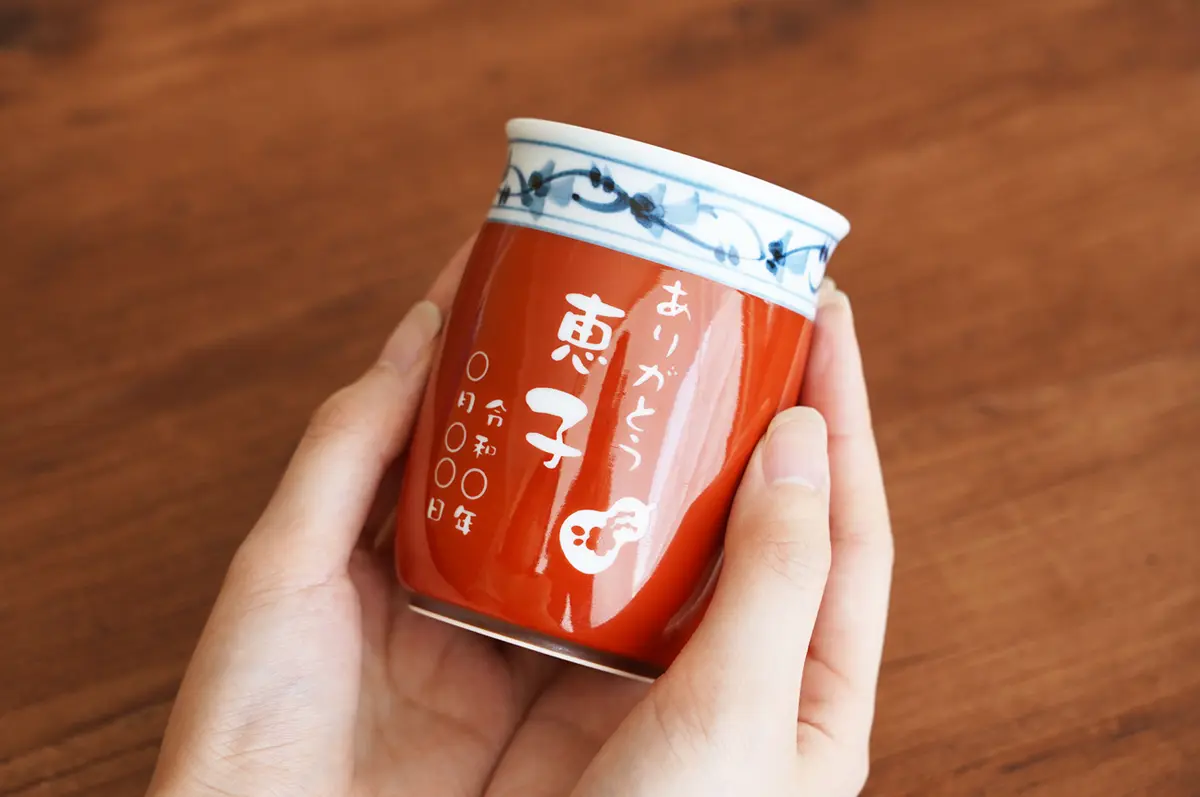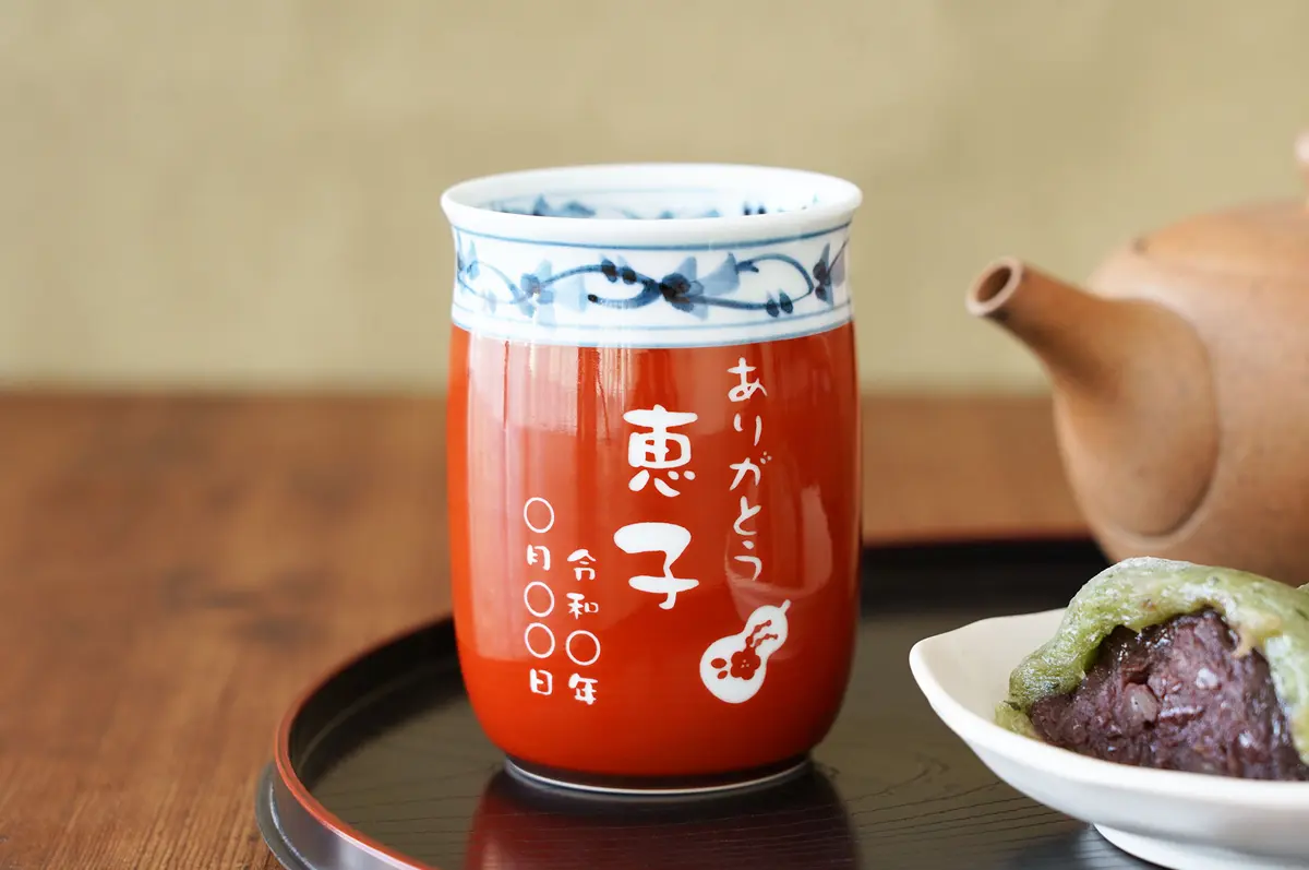 お名前だけでなく、縁起のいいモチーフや日付を彫刻できる湯呑みです。縁起モチーフはひょうたん・鶴と羽子板・桜・梅・打ち出の小槌の5種類から選べます。