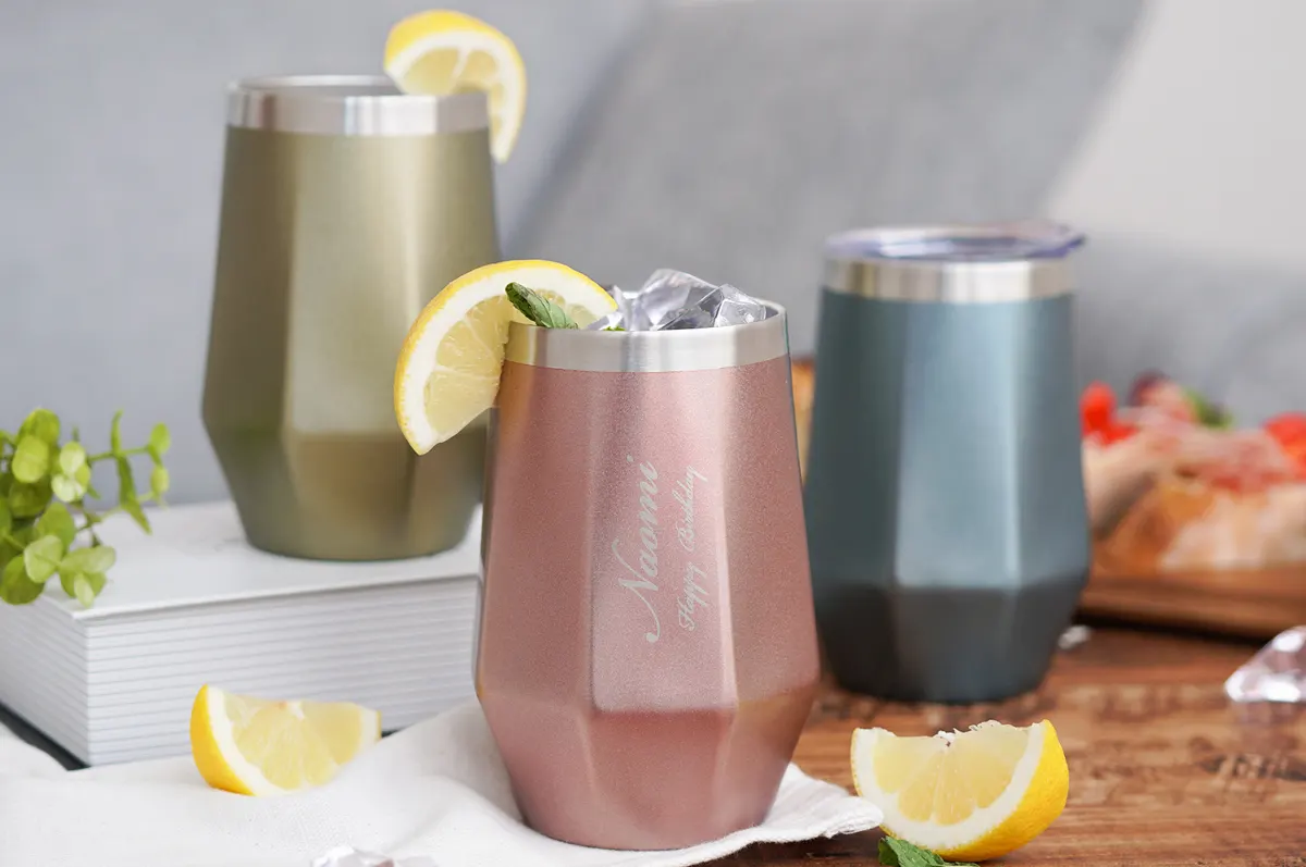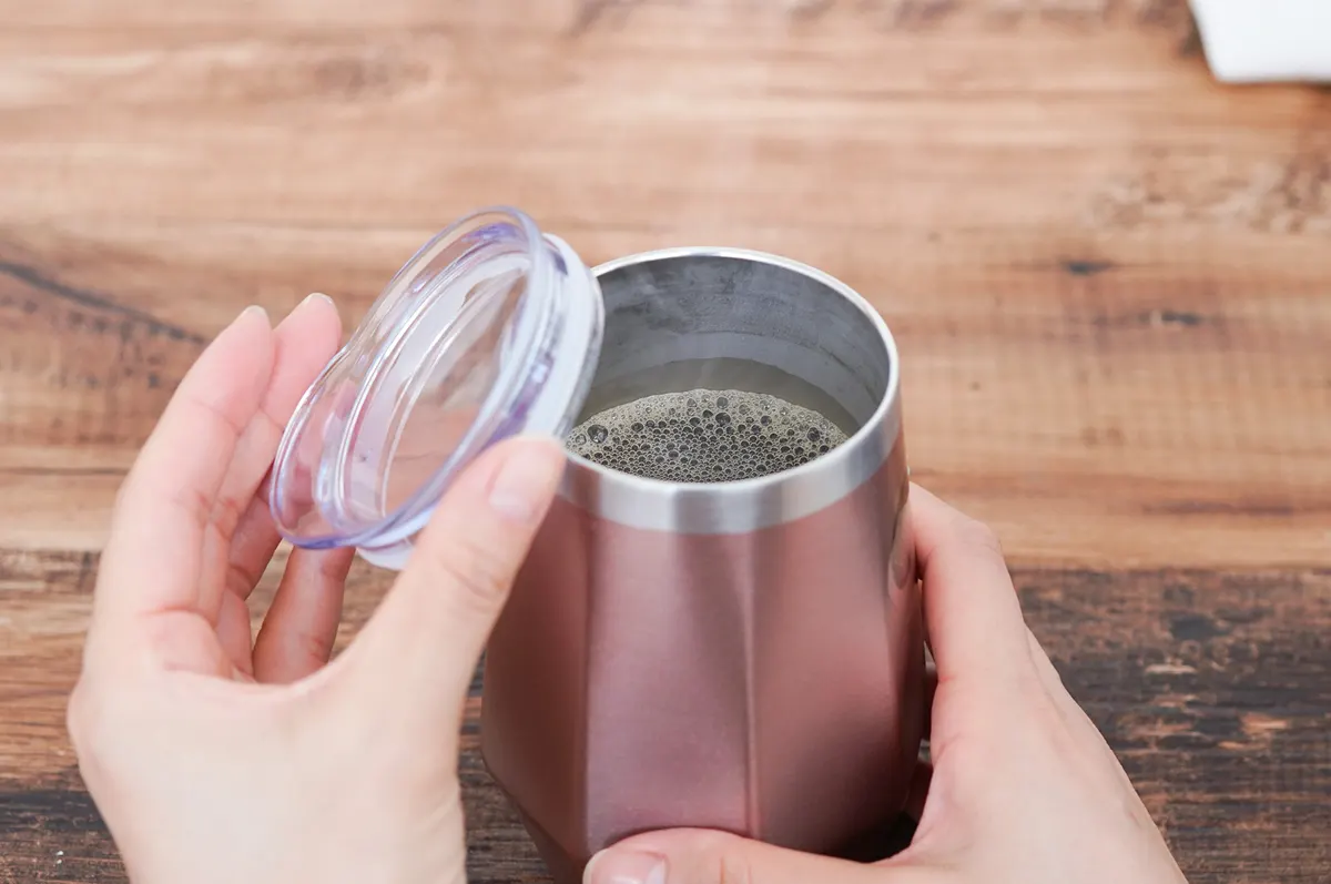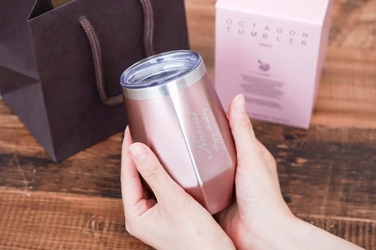 個性的な八角形のフォルムが特徴的なステンレスタンブラーです。「真空断熱二重構造」により、冷たいものも温かいものも長時間飲みごろ温度をキープ。中身が見える透明フタ付きなのも嬉しいポイントです。