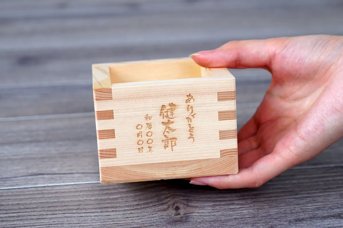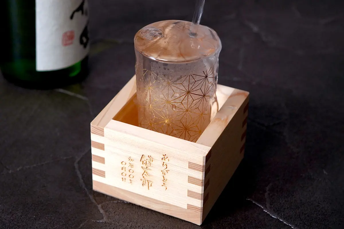 枡は「福が“増す”」「“益々”繁盛する」などの意味がある縁起物。日本酒の美味しさを引き立てるヒノキの香りとともに、贅沢な晩酌タイムを堪能できます。