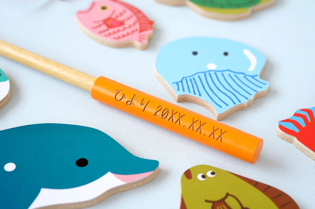 さかな釣りとジグソーパズルの2通りが楽しめる、フィッシングパズル。釣り竿にお名前を入れることで「自分専用」として特別感を感じられるように。