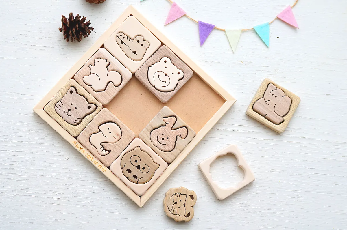 9種類の動物をモチーフにした木のおもちゃ動物パズル。