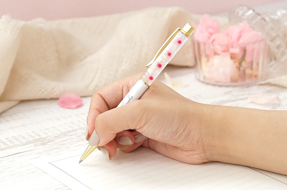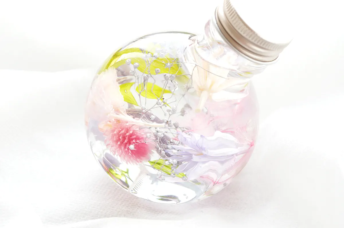 コロンとした手のひらサイズのハーバリウムと、贈る人に合わせて色が選べるハーバリウムボールペン。心をいやすグッズと実用的なアイテムを組み合わせたギフトセットです。