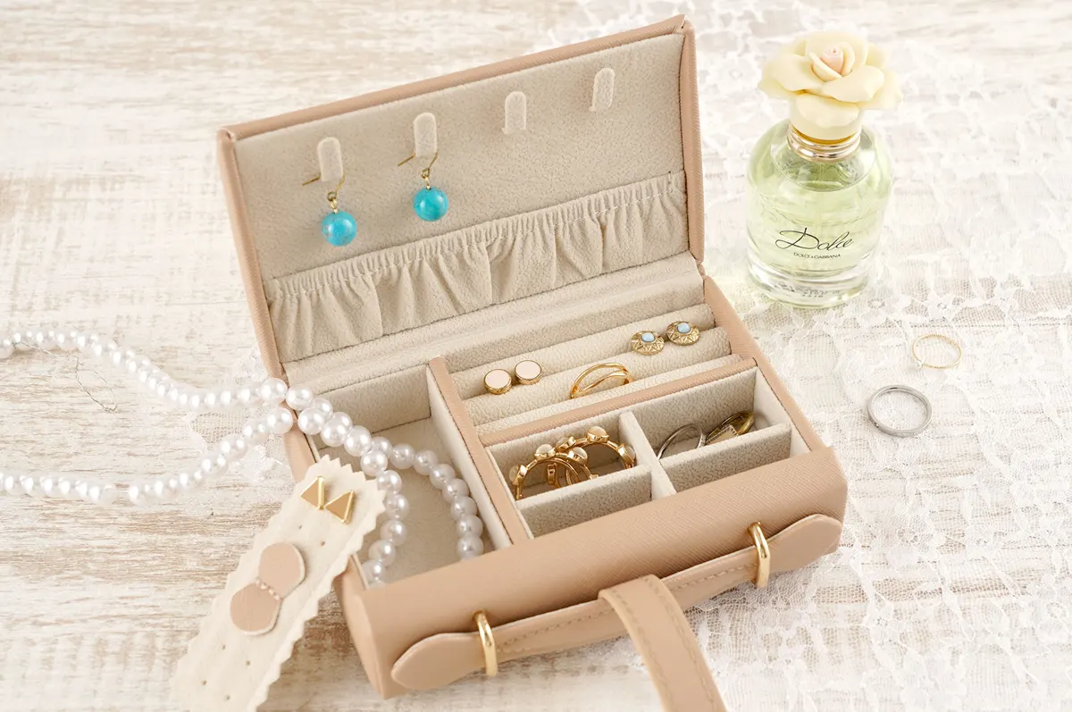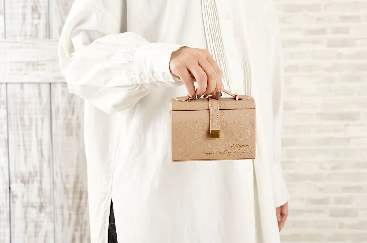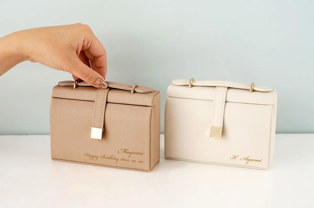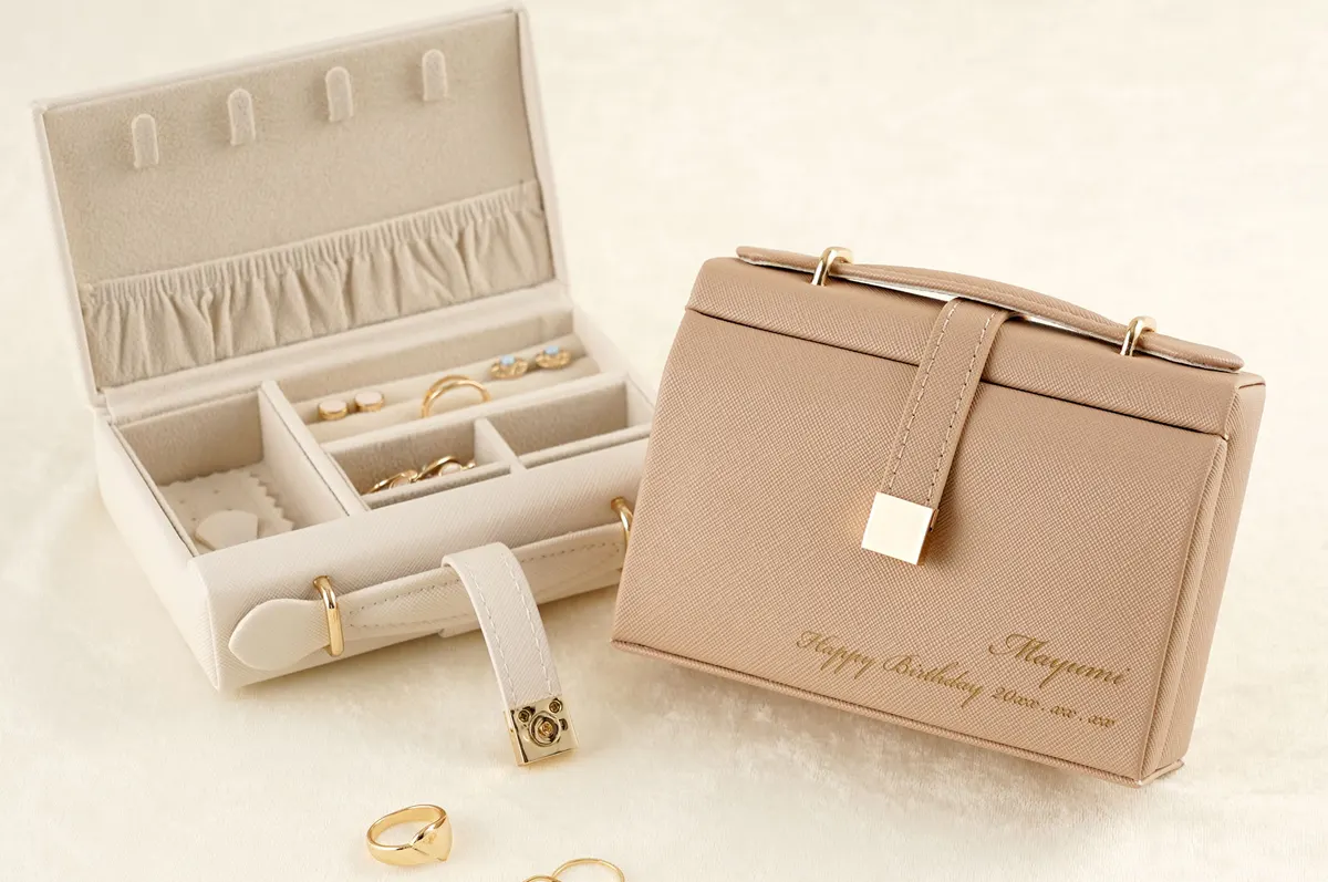 収納力ばっちりの持ち運べる名入れクラッチ型アクセサリーケース。近年人気が高まりつつある「くすみカラー」の2色からお選びいただけます。
