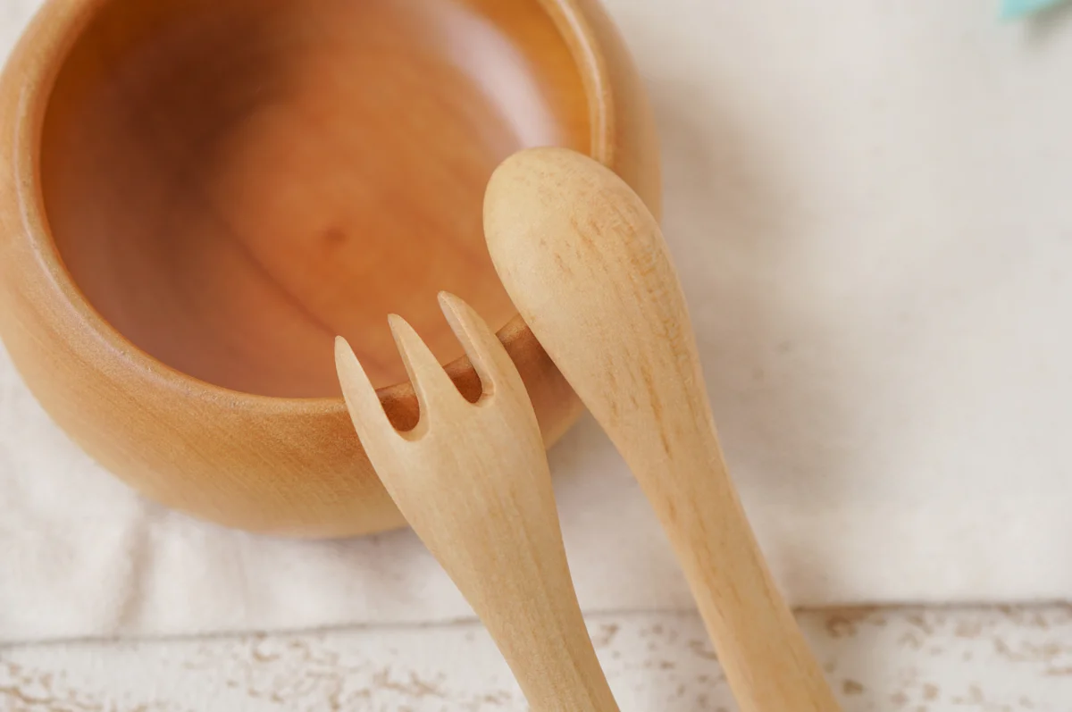 木製のボウル・スプーン・フォークの食器3点セット。木のぬくもりを感じる、コロンと可愛い食器です。