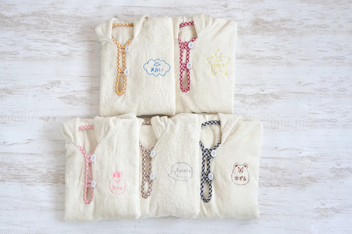 襟の色と胸元のお名前刺繍のモチーフはそれぞれ5種類から選べます。自由に組み合わせて、特別感たっぷりおそろいコーデのできあがり♪