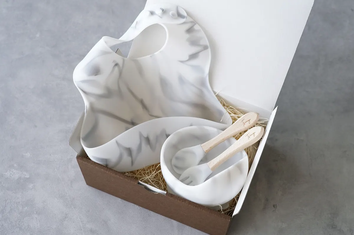 使い勝手の良いシリコン製食器の4点セットです。ボウルは吸盤付きで机にピタッと密着。ひっくり返しを防止してくれるので、食中・食後の家事の時短になります。カラバリ豊富な7色展開なので、贈るママパパの好みや双子ちゃんの雰囲気に合わせて選べます。