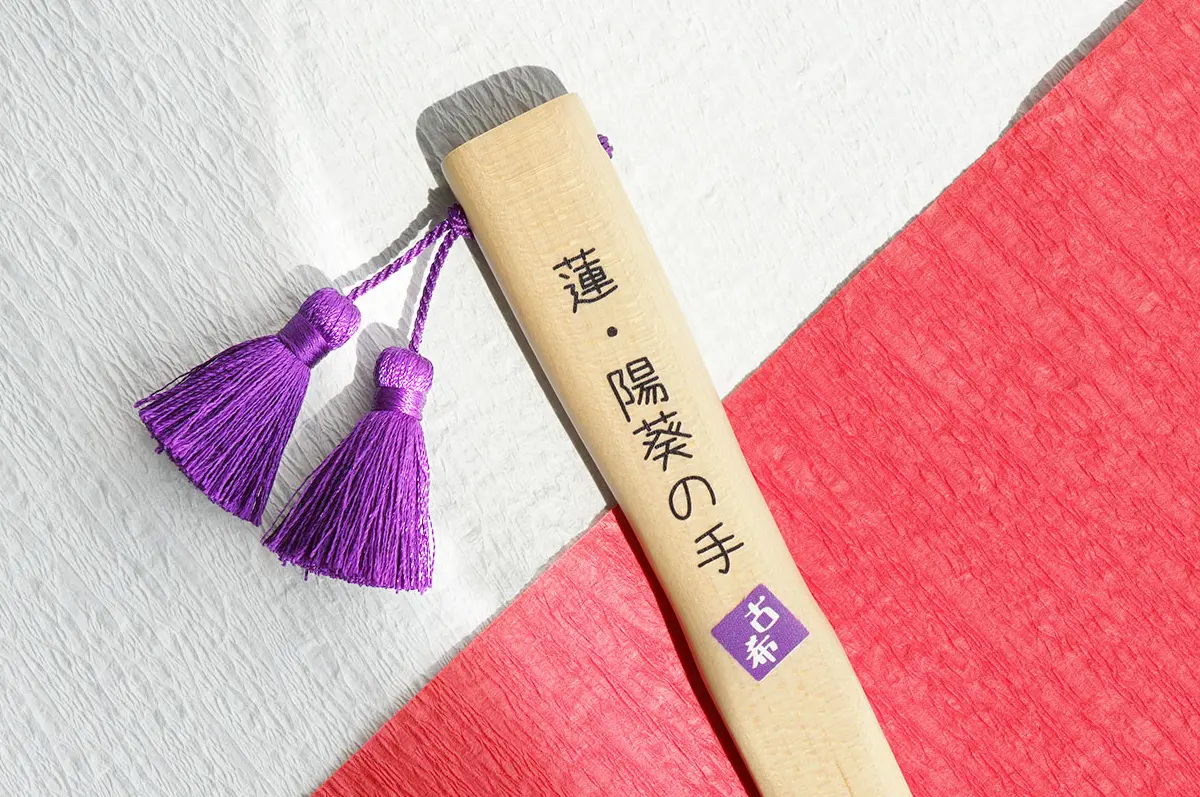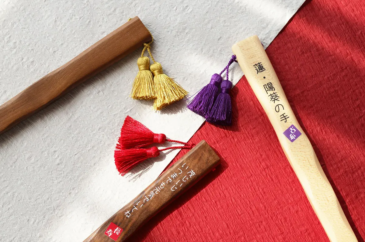 還暦や古希などの長寿祝いに贈るならこちらもおすすめ。長寿カラーに合わせて選べるタッセルと落款印風のプリントがお祝いムードをより一層引き立てます。先端は適度なエッジでかき心地も◎