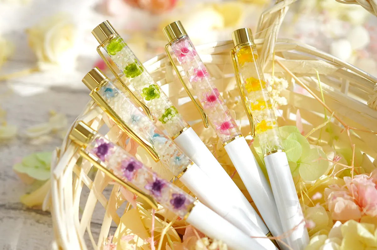 小さなお花がぎゅっと詰まったハーバリウムボールペンです。さらさらと滑らかな書き心地の水性インクは、普段使いにぴったり。無料で付属するメッセージカードはおしゃれな英文の定型タイプと、自分のことばで書けるフリーメッセージタイプから選べます。