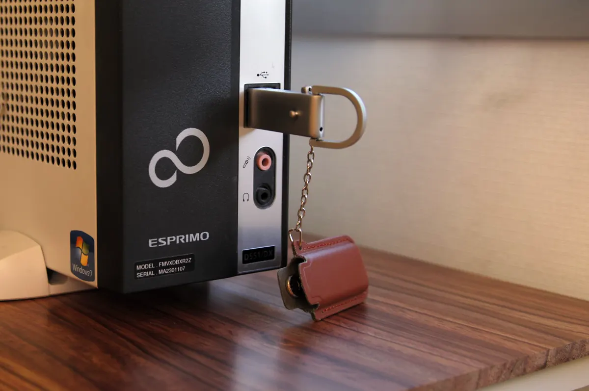 ついつい無機質になりがちなデスク周りで、おしゃれなレザーカバーが目を引くUSBメモリです。カバーと本体はスナップボタンで留められるので、持ち歩いている間もしっかり本体を守ります。