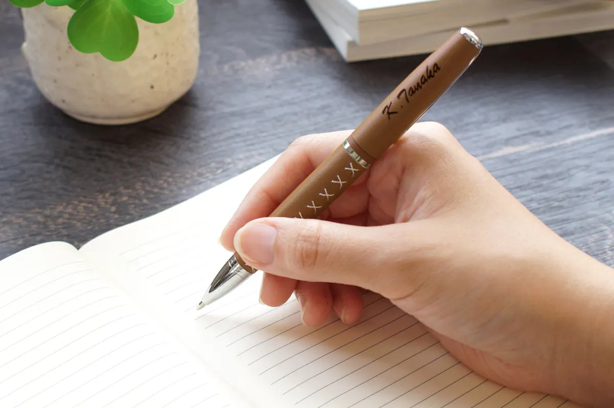 編み上げデザインのアクセントが印象的なボールペンです。革巻きだから手触りもさらりとしていて、握り心地や書き心地をしっかりサポート。