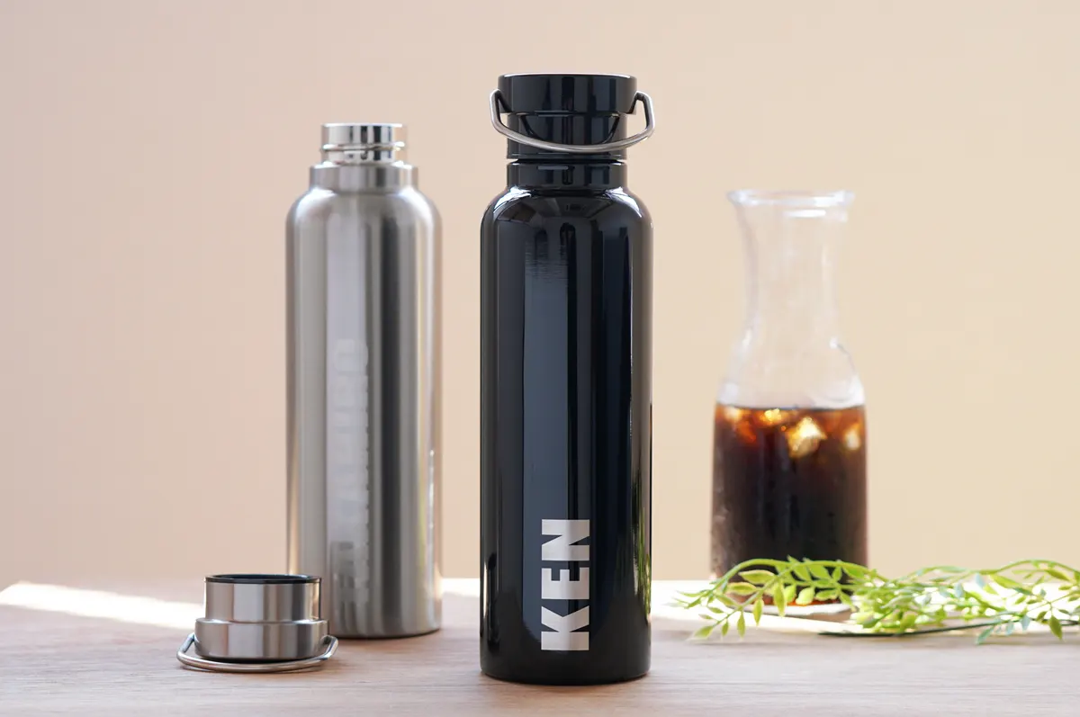 インパクトのあるロゴ風の名入れが際立つステンレスボトル。容量はたっぷりの500mlですが、スチールリング付きなのでラクラク持ち運べます。