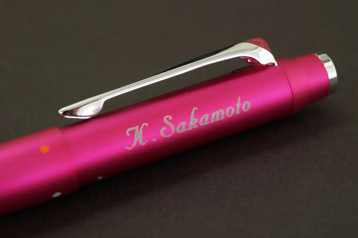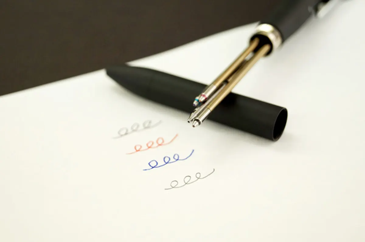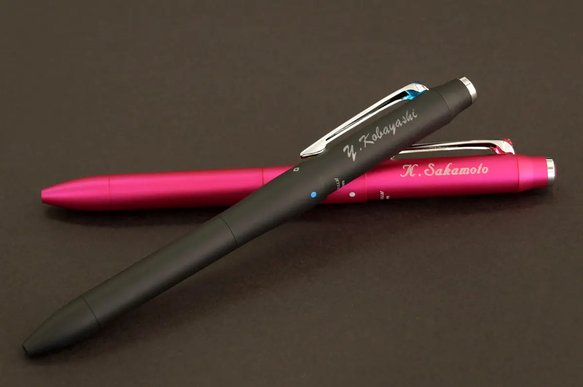 クセになる、なめらかな書き味が特徴の名入れ多機能ペン。3色ボールペンにシャープペンシル機能が備わっています。