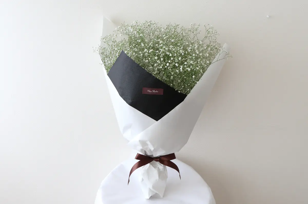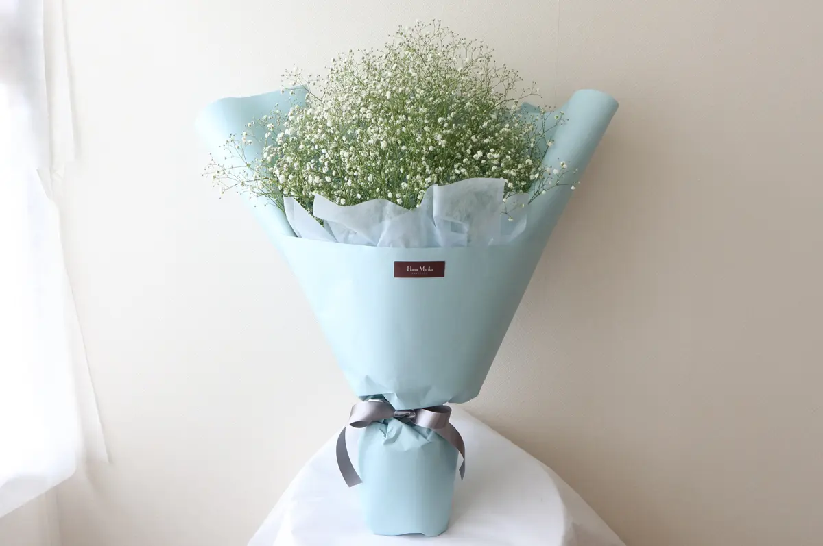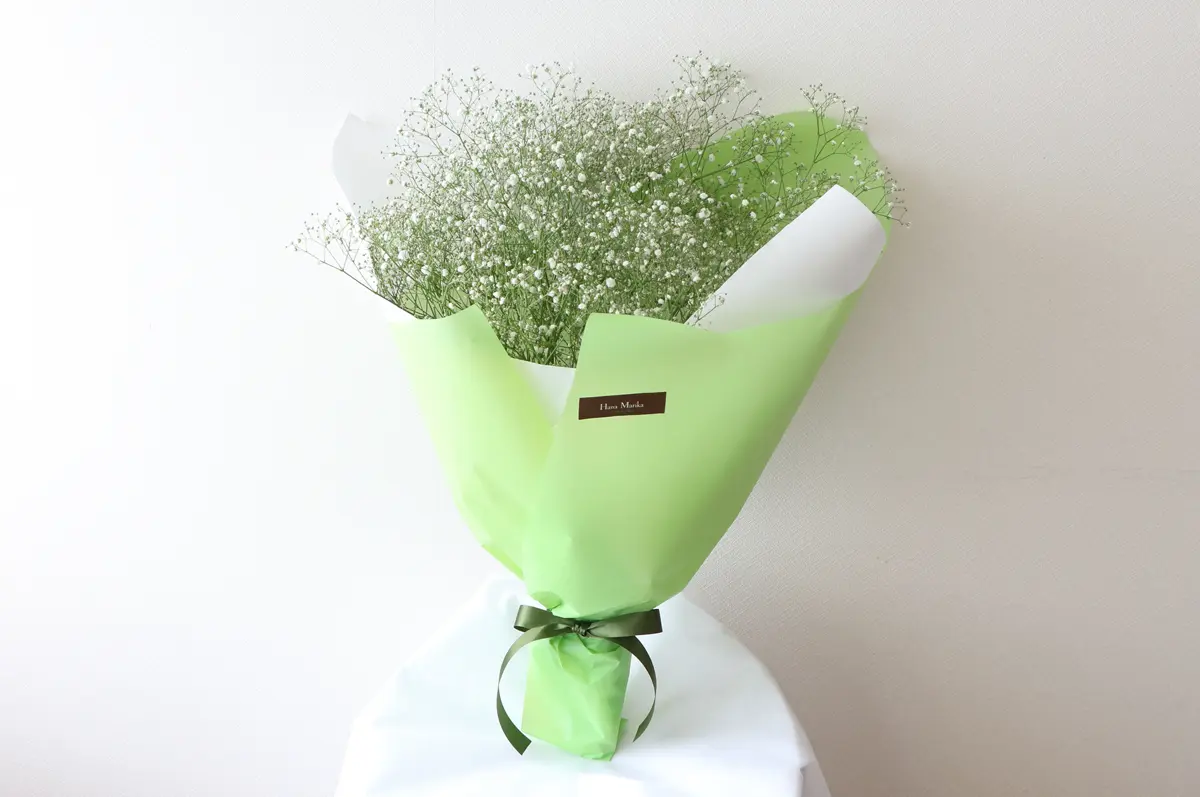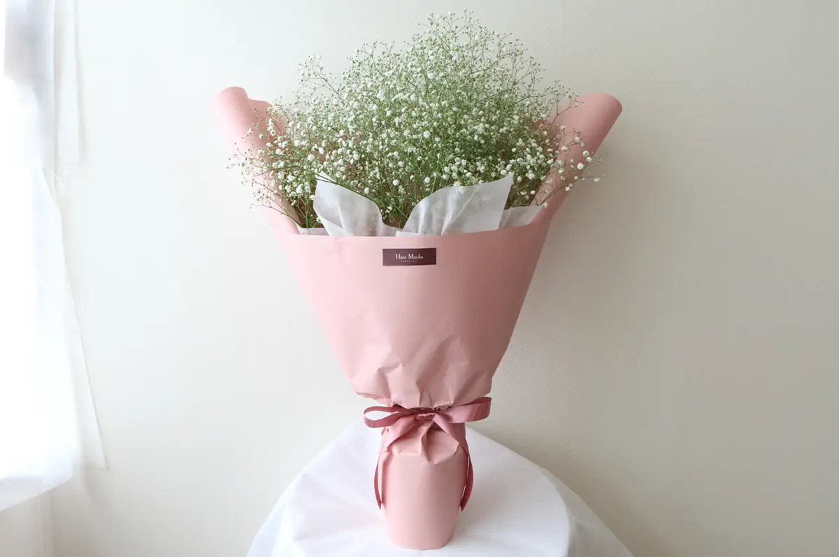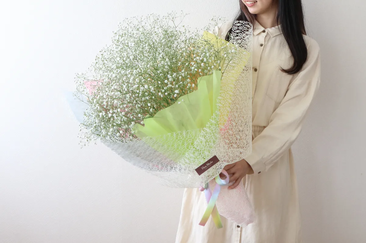 ナチュラルな白いかすみ草だけを束ねたふわふわの花束。注文が入ってからバイヤーが花市場へ買い付けに行くので、高品質のかすみ草が鮮度抜群の状態で届きます。お相手の好みや用途から選べる5種類のラッピングもポイントです。