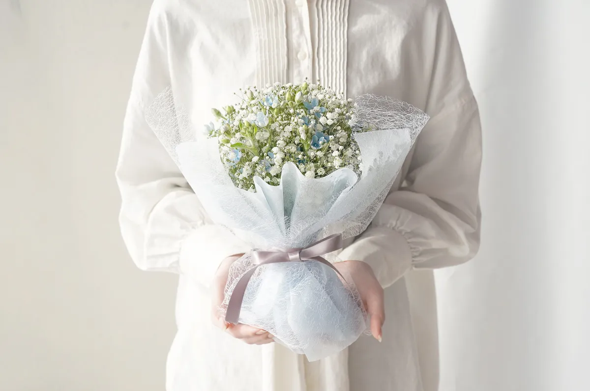 真っ白なかすみ草と涼やかなブルースター、人気の2種がひとつになったまんまるブーケ。ブルースターには「信じ合う心」「幸福な愛」などの花言葉があり、かすみ草と同じくウエディングフラワーとして人気があります。愛と感謝を伝える花束に、大切なあの人への想いを込めて。