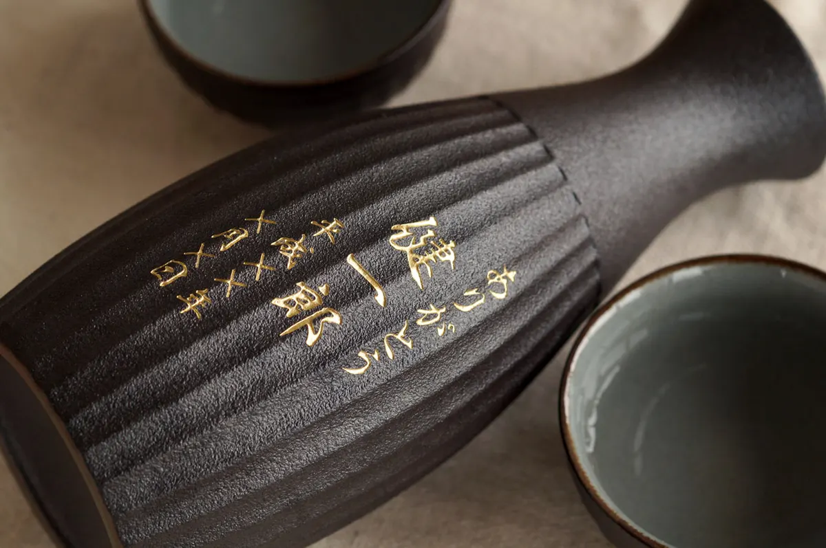 鉄器のような重厚感と陶器の使いやすさをあわせ持った、徳利とおちょこの3点セット。シックな質感に、華やかなゴールドの彫刻が際立ちます。徳利の容量は170ml。日本酒の適量は1日1合(180ml)までと言われているので、飲み過ぎを防止して健康的に楽しめます。
