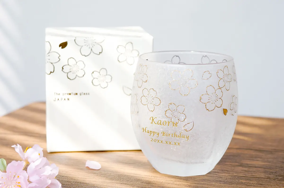 きらめくグラスに、ゴールドの桜柄と名入れ彫刻がよく映えます。ころんと丸いフォルムと華やかな雰囲気が、女性からも人気です。日常使いにぴったりな強度もあわせ持っているので、実用性バツグン。