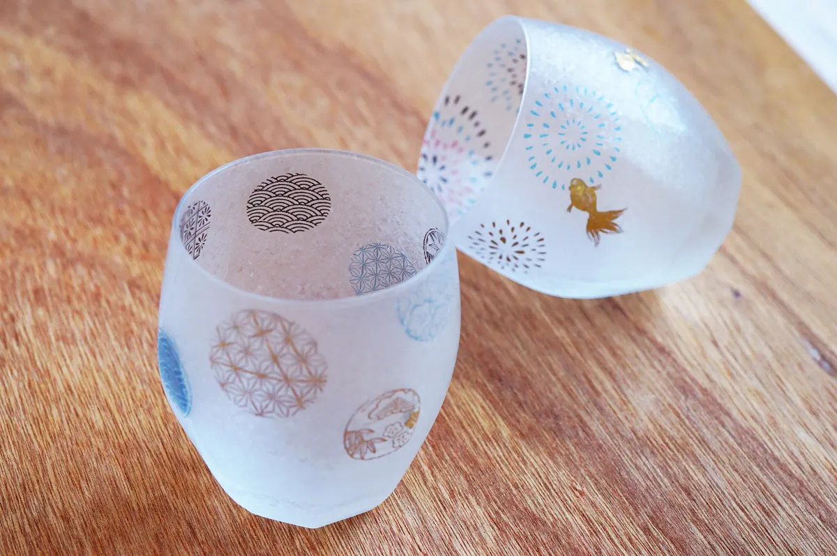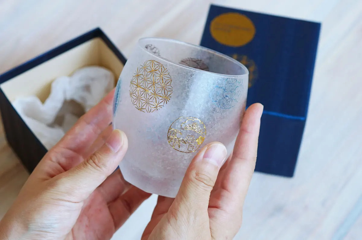 丸みを帯びたフォルムと、輝く和柄が特徴的なロックグラス。光の角度によってきらめく特殊加工が施されており、お酒の冷たさやおいしさが引き立ちます。描かれている柄は全部で5種類。贈り物にぴったりな、縁起のいい意味ばかりです。