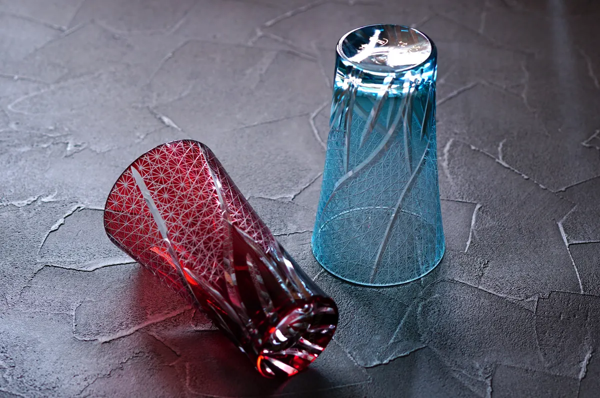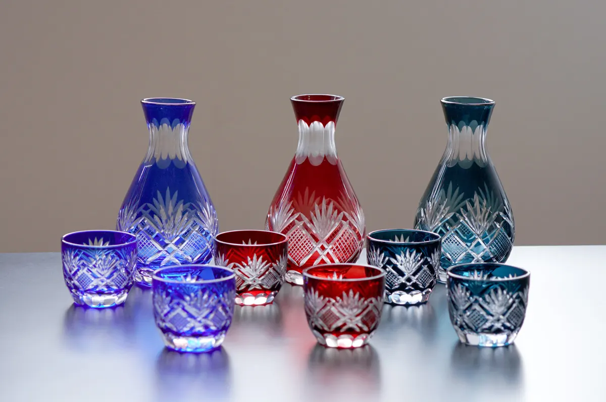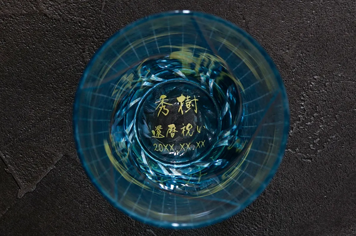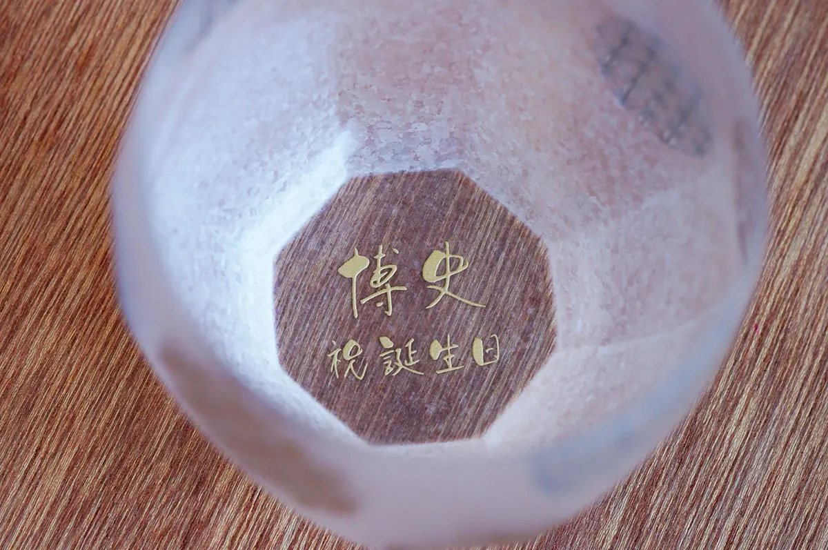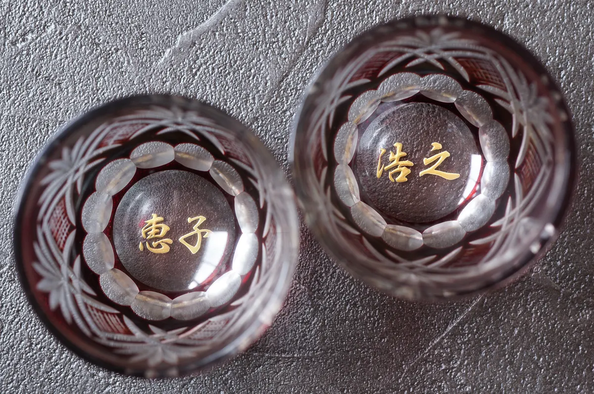 華やかな光の屈折と透明感ある色彩が、ずっと眺めていたくなる美しさです。おちょこの名入れは1点ずつ指定できるので、ペアセットとして贈ることもできます。