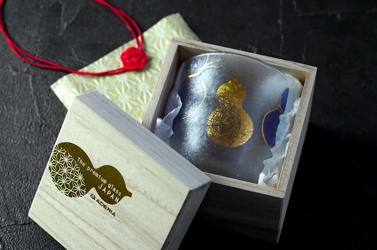 6つの瓢箪(ひょうたん)が踊る『六瓢箪』柄のロックグラス。六瓢箪は「六瓢=ムビョウ=無病」につながり、「健康長寿」や「家内円満」もたらすと言われる縁起柄です。お酒が大好きだけど、そろそろ体の調子が心配なご両親やおじいちゃん・おばあちゃんに。大切な人の健康を願う贈り物にぴったりです。