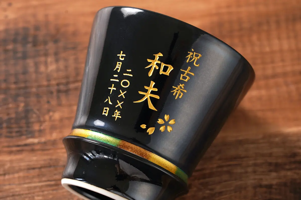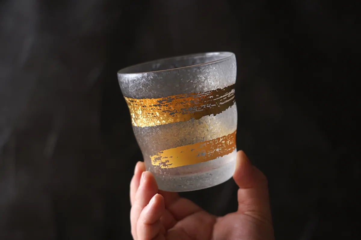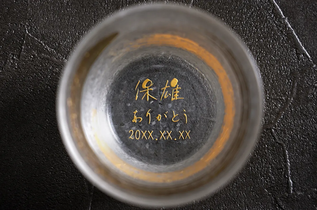 勢いよく描かれた金色の一文字が、モダンな趣を感じさせます。グラス表面は手触りもよく、しっくり手になじむフォルムです。きらめくグラスに映える金色の筆運びと底面の名入れ彫刻が、プレミアムなひとときを演出します。