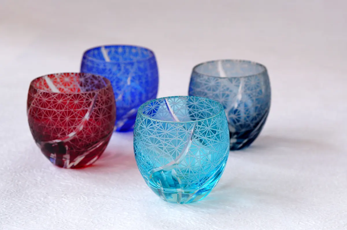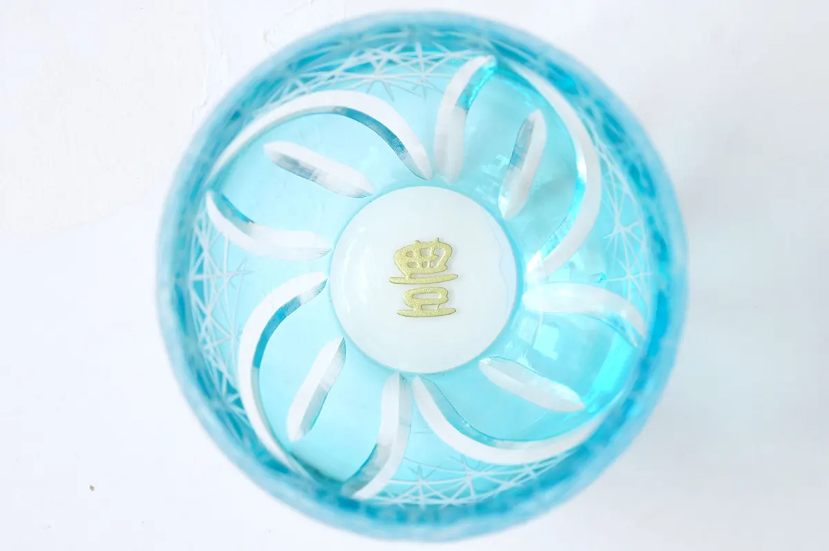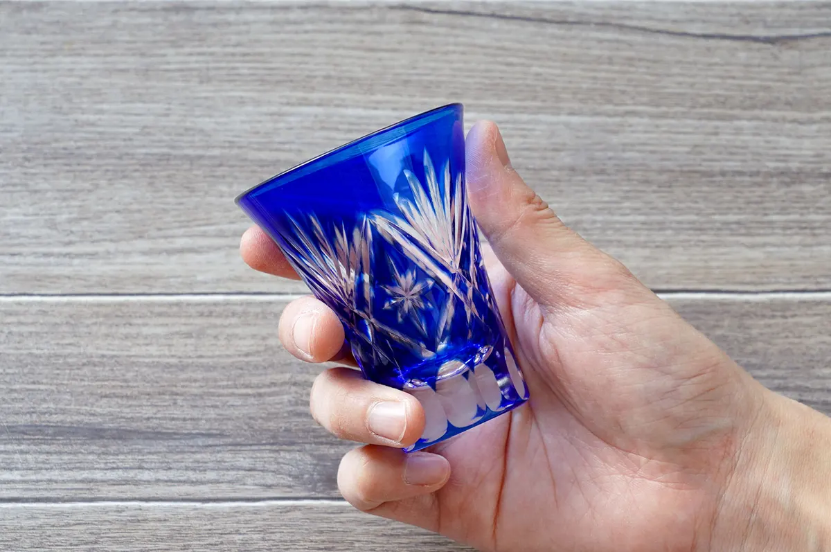 華やかな光の屈折が目を引く、菊つなぎ模様の切子ぐい呑み。熱燗・冷酒どちらにも対応しています。おつまみを盛り付ける小皿としても使えるので、色違いでそろえたくなる万能グラスです。ひとつひとつ手づくりしているからこその個性が楽しめます。