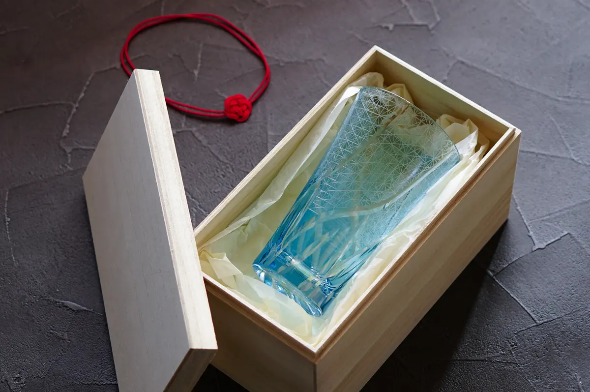 約80mlの小さめグラスと、国産天然ヒノキを使用した枡のセットギフト。グラスを枡に入れてお酒を注げば、おうちで贅沢なこぼれ酒が楽しめます。グラスに施された美しい装飾と、ヒノキの心地よい香り。見て、嗅いで、飲んで堪能できる豪華セットです。