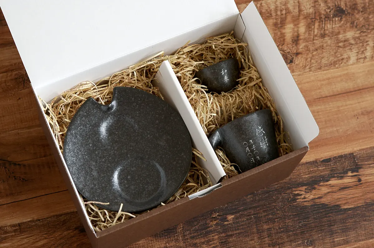 美濃焼の片口・盃(さかずき)・受け皿のセットギフト。受け皿に片口と盃をセットしてお酒を注ぐと、せせらぎのように流れる様子をお楽しみいただけます。