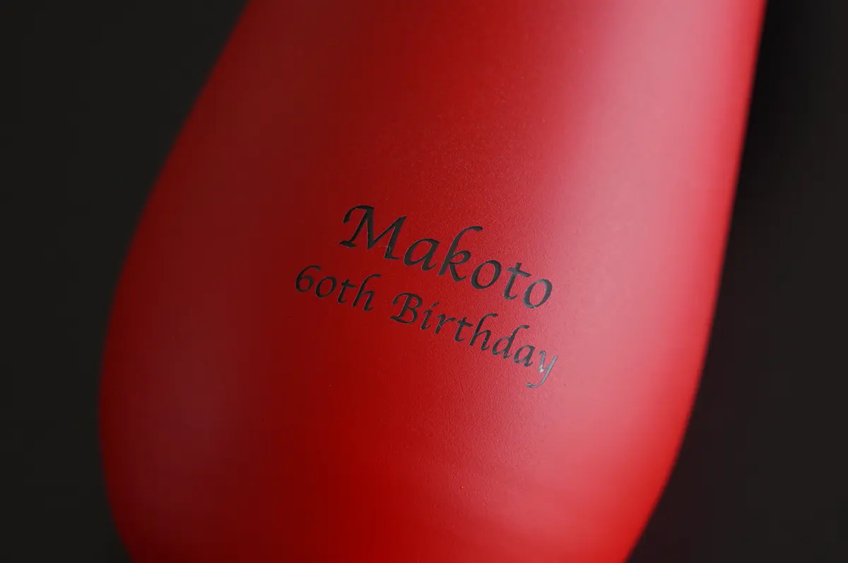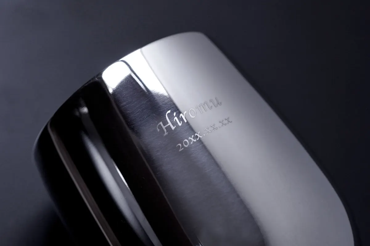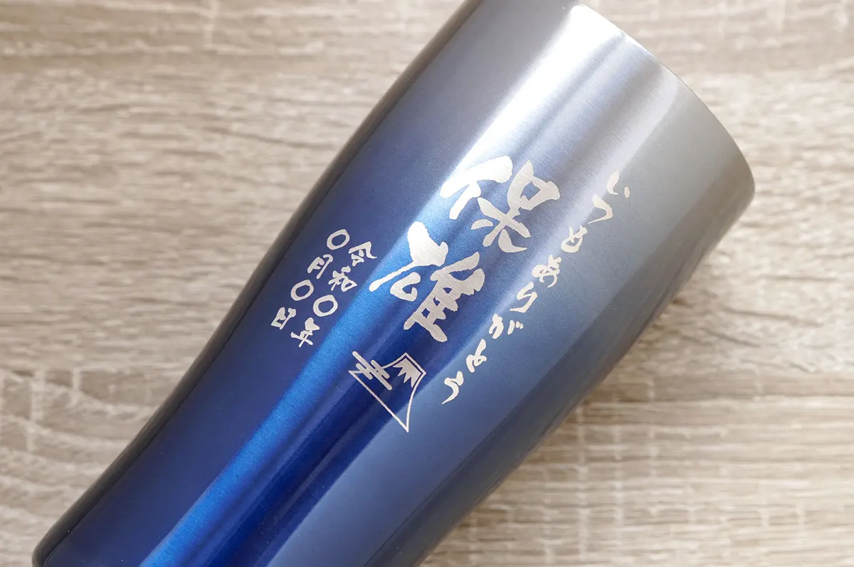 驚きの容量800mlを誇る特大ステンレス製タンブラー。大瓶ビール1本分もまるっと入るサイズは、居酒屋のビールジョッキ「大」に匹敵します。ただでさえ目を引く特大タンブラーに、インパクト抜群の巨大な名入れ彫刻。面白さと男らしさを感じるデザインです。