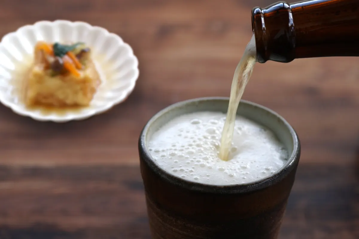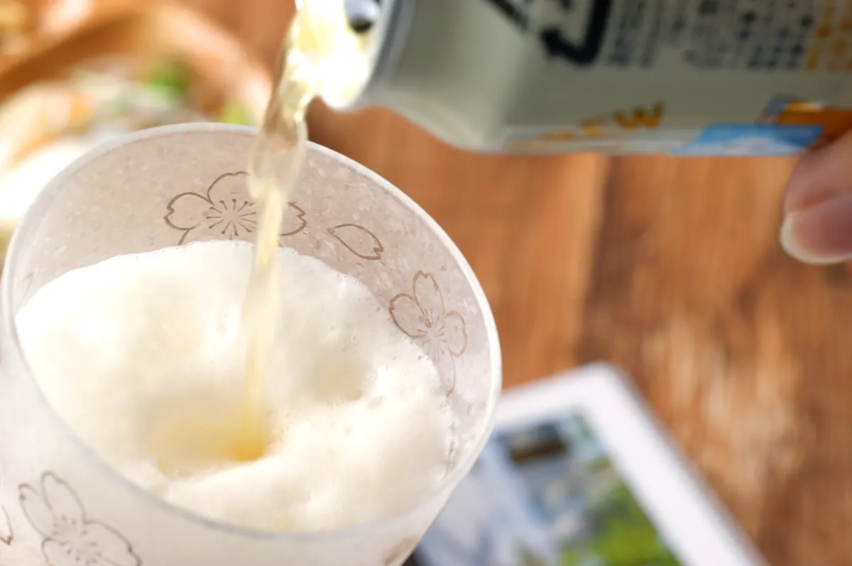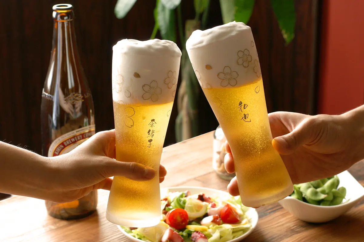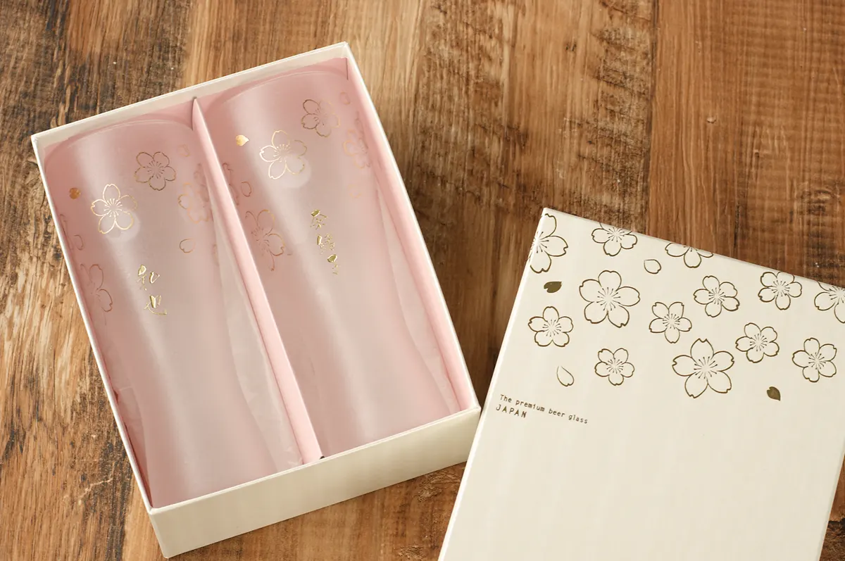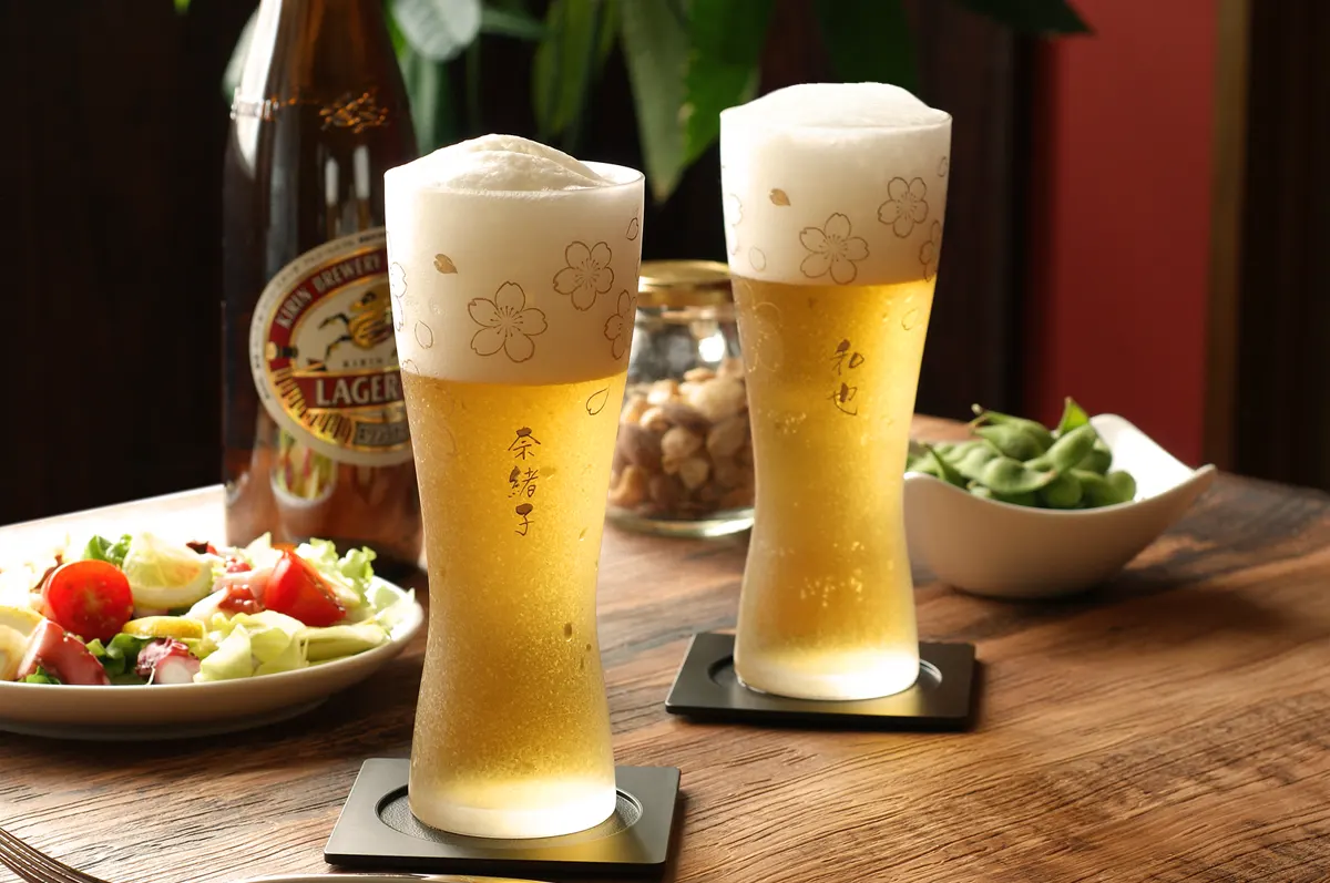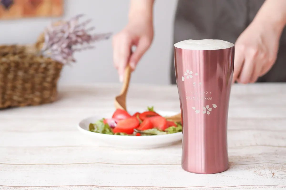桜の花びらがきらめくビアタンブラー。注がれたビールに浮かぶ桜の花びらが幻想的な美しさを醸し出します。