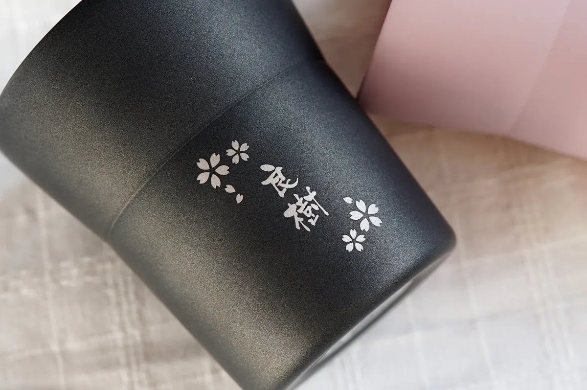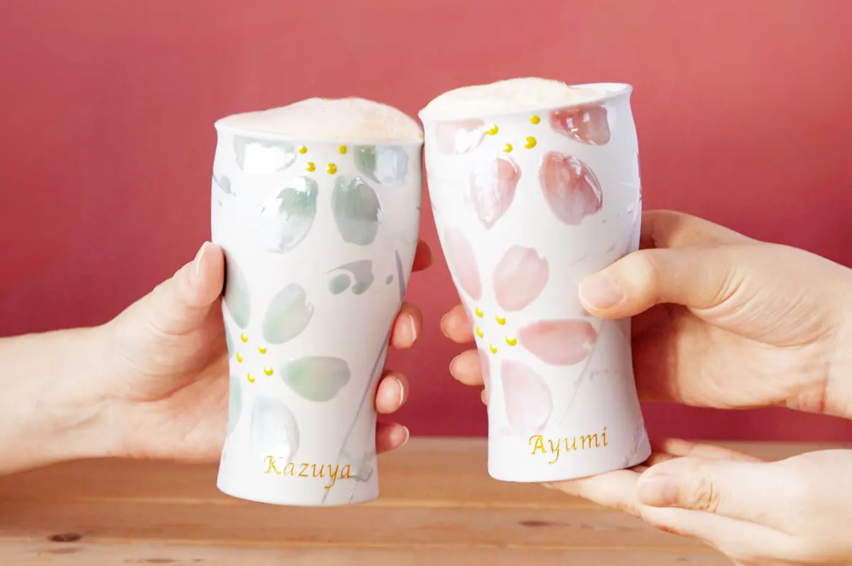 国産美濃焼の桜柄のペアタンブラー。フロストガラスのような凹凸のある表面は、陶器製だからこそ味わえる魅力です。