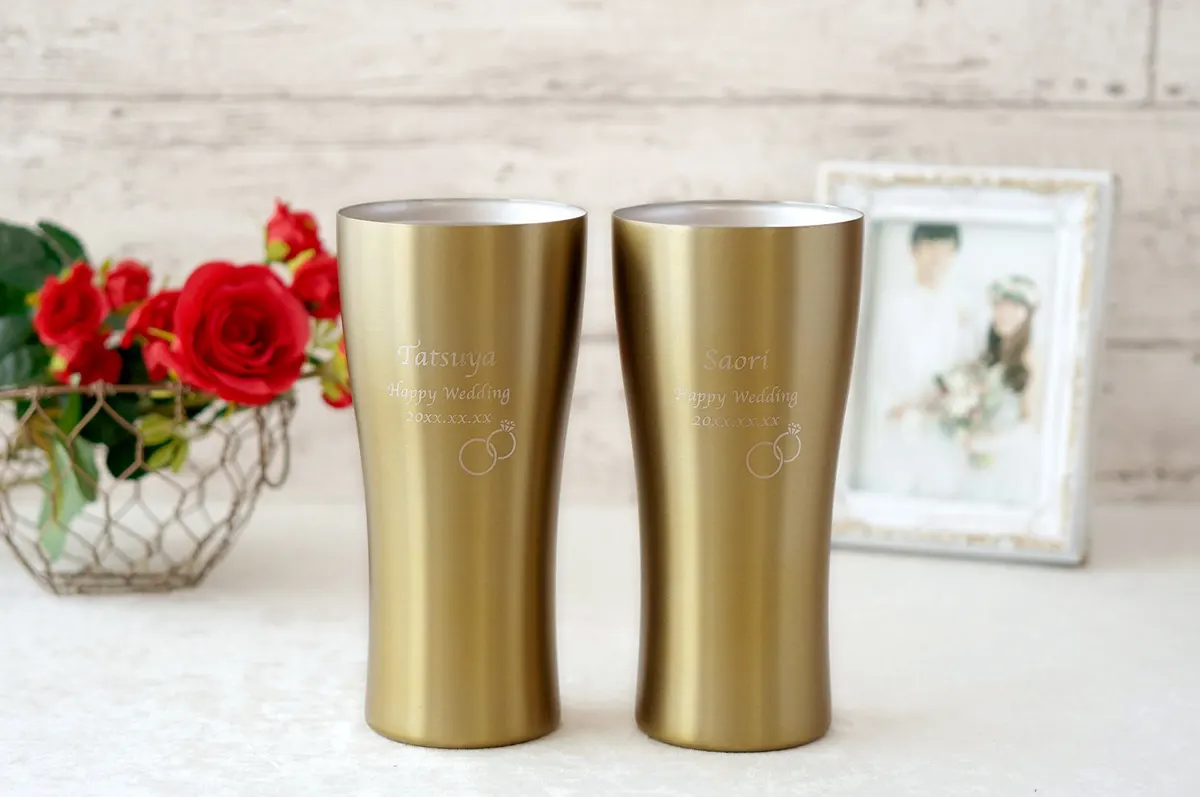 お祝いにぴったりなマットゴールドのペアタンブラー。リッチなゴールドの色合いが、お祝いの品にぴったりな商品です。名入れのフレームパターンは、お祝いのシーンに合わせて5種類から選べます。