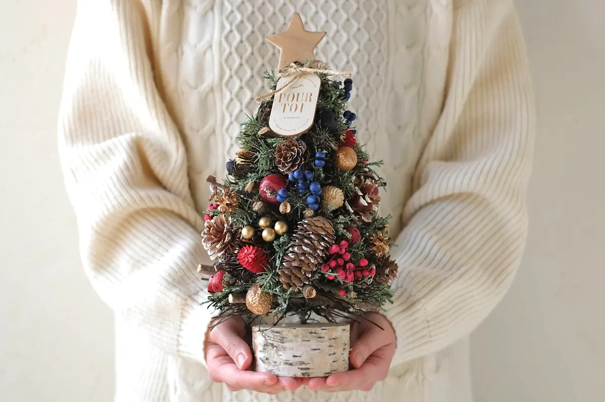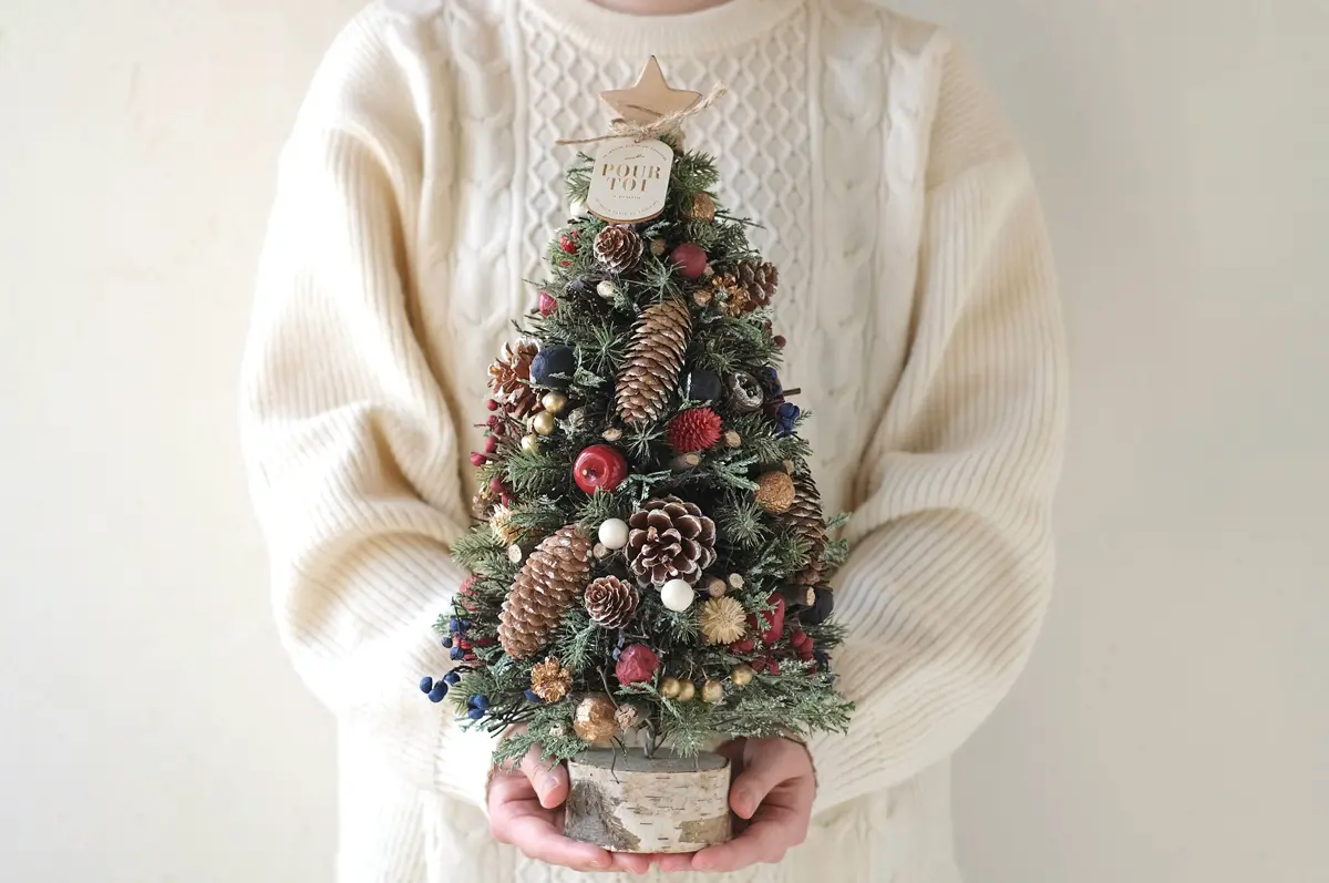 天然木の素材や質感にこだわっており、オーナメントも松ぼっくりなどナチュラルテイストのものが多く使われます。