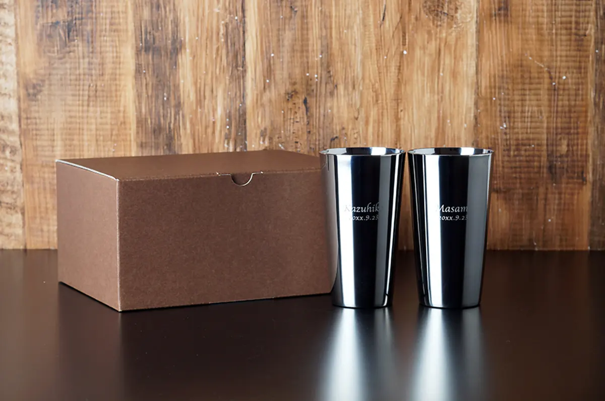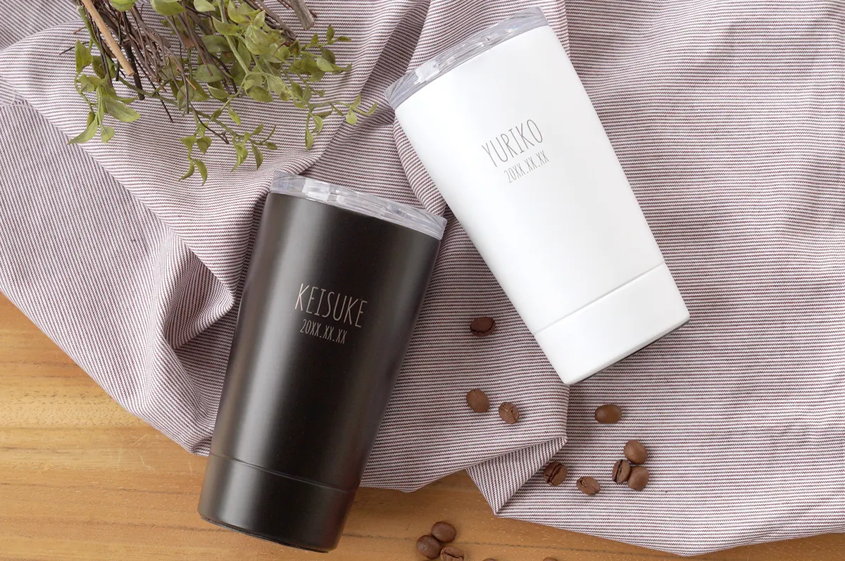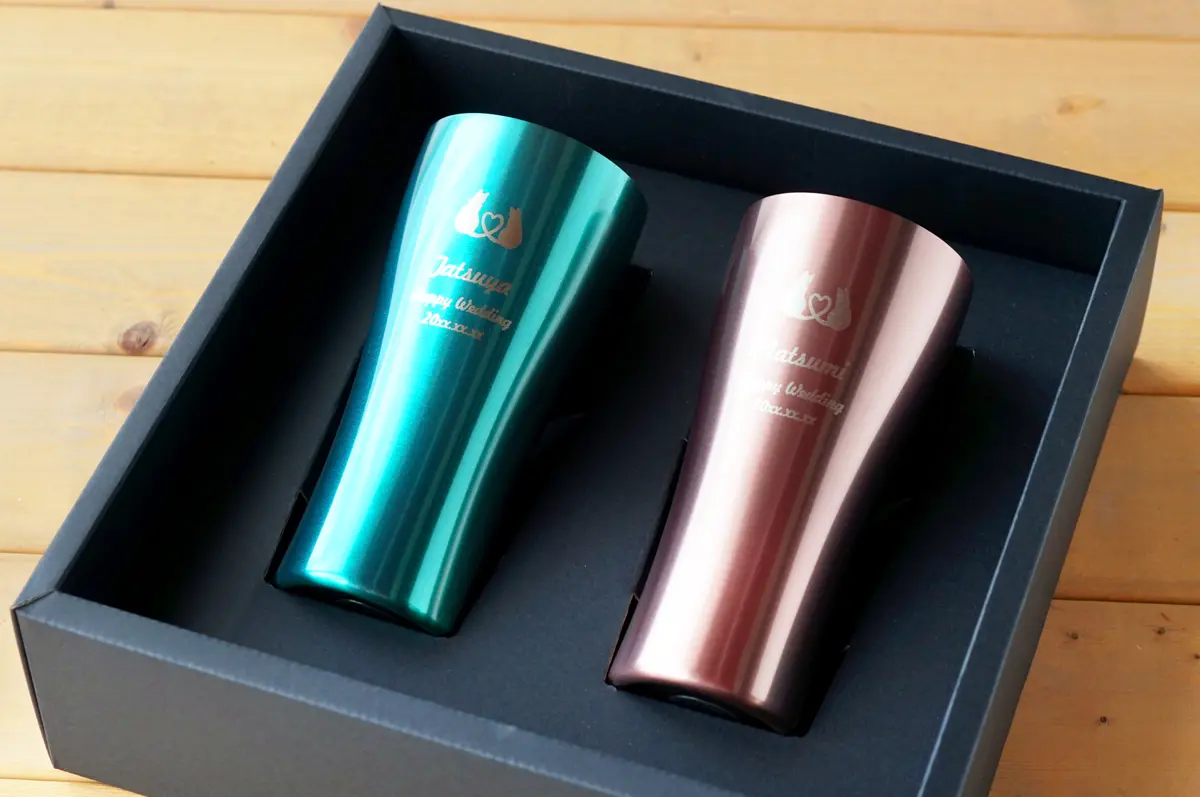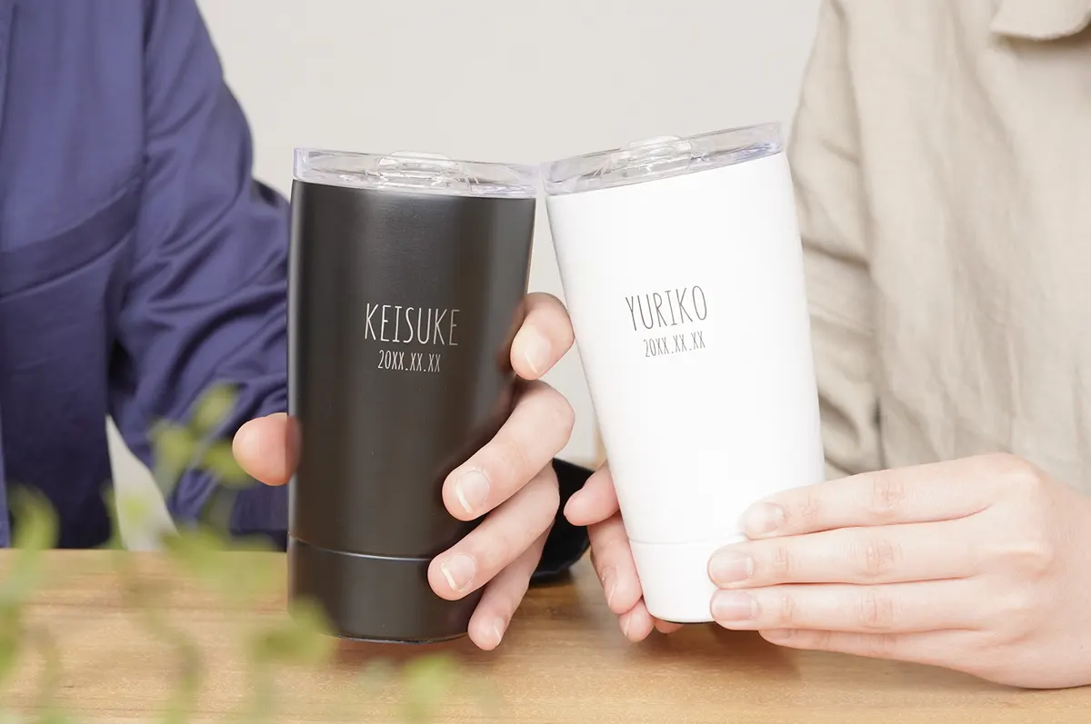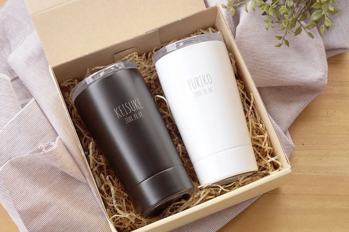 その中でも結婚祝いにおすすめなのは、オリジナルの彫刻が入れられる「名入れ」タンブラー。オーダーメイドだからこそ演出できる特別感が大きな魅力です。タンブラー自体は決して珍しいものではありませんが「時間をかけて、あなたたちのために選んだプレゼントです」というメッセージが自然に伝わります。