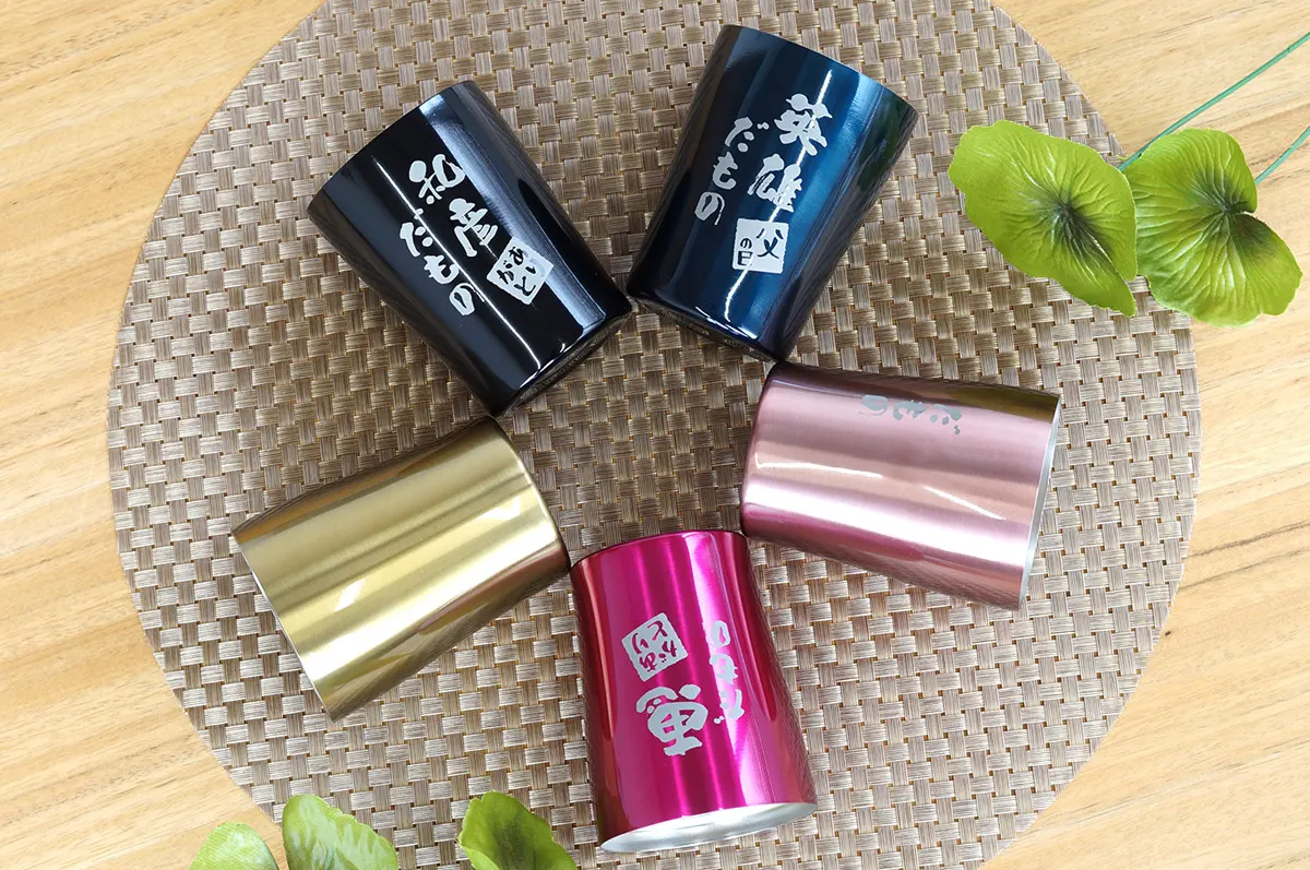 和風の彫刻が印象的なショートタンブラー。250mlの飲みきりサイズだから、コーヒーやお茶にも使えて1日中活躍してくれます。カラーの組み合わせは実に15通り。落かん印風のメッセージは「感謝」「おめでと」「今年の年号(令和○年)」など13種類から選べます。