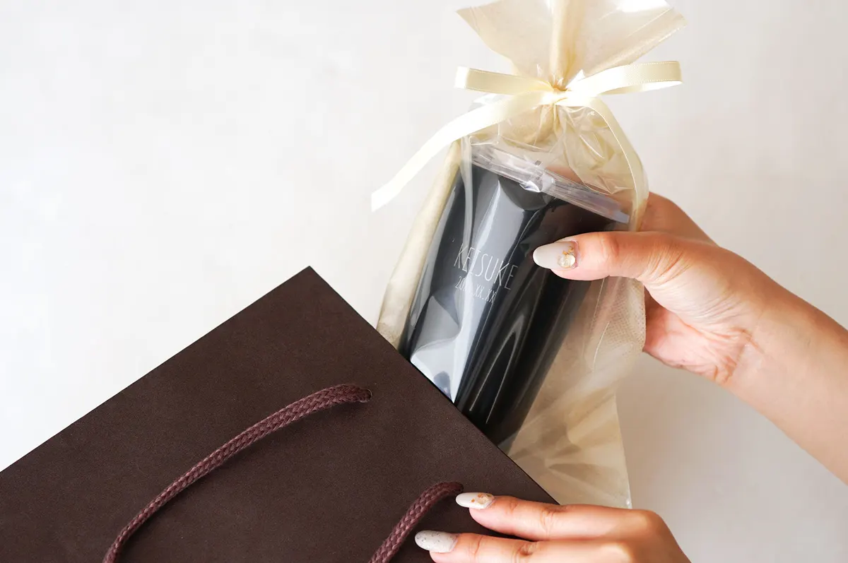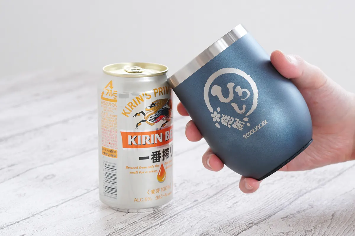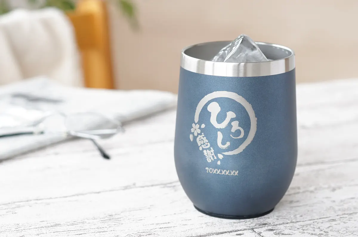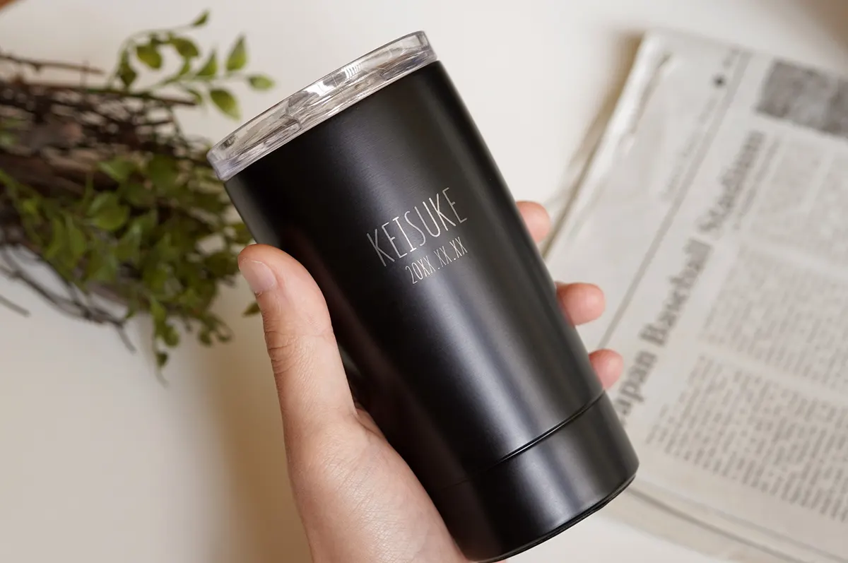 ロゴのようなシンプルな名入れが特徴的な、モバイルタンブラー。派手すぎないけれど、特別感を失わないデザインに仕上げました。