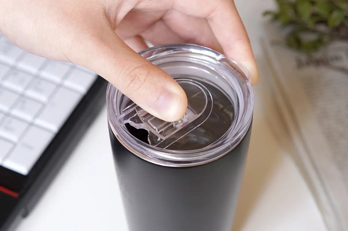 フタつきで持ち運びやすく、車内のドリンクホルダーに入るサイズ感です。パトロールやパソコン作業、書類作成など、幅広いシーンで活躍します。