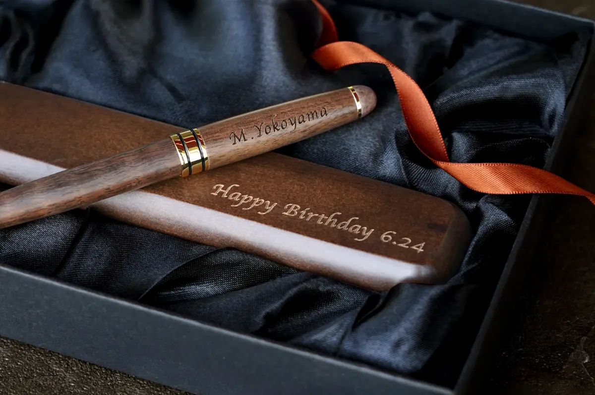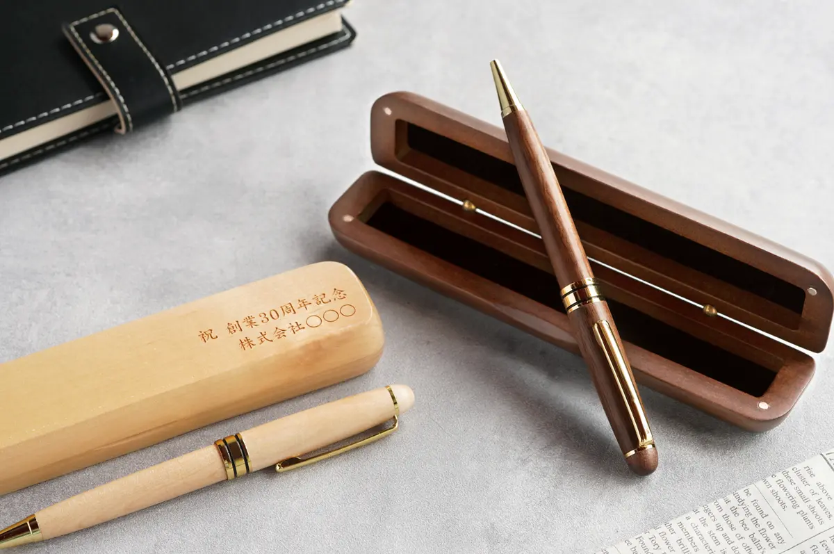 天然木のぬくもりを感じる名入れボールペン&名入れケースセット。老若男女問わないデザインなので、卒業・入学祝いなどの贈り物として選ばれています。