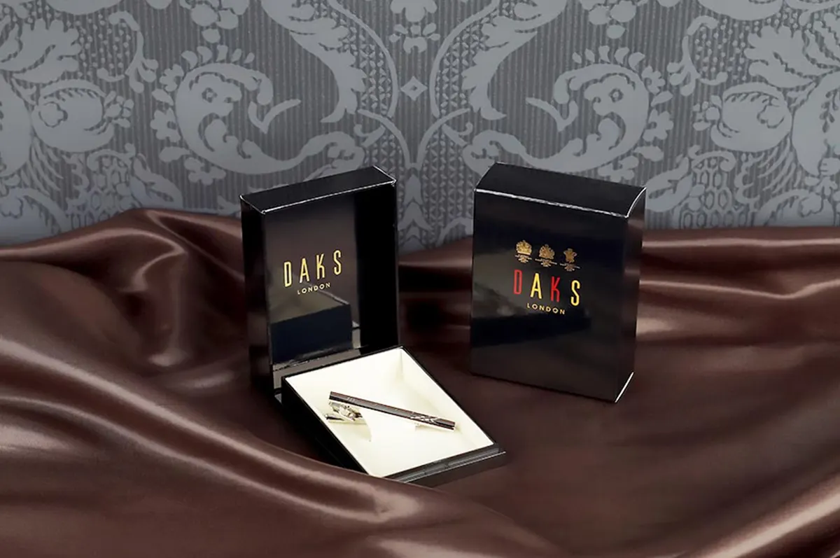 英国のトラディショナルブランド『DAKS』の名入れネクタイピン。スーツやシャツと組み合わせれば、さりげないオシャレコーディネートにグレードアップします。