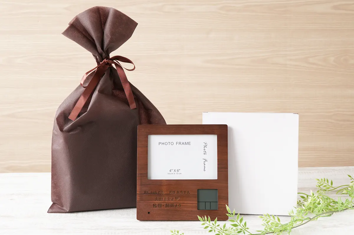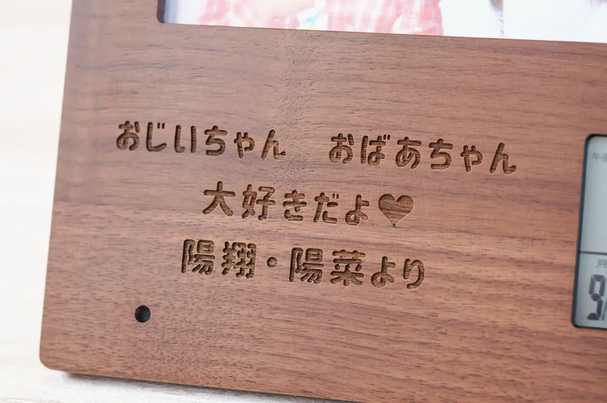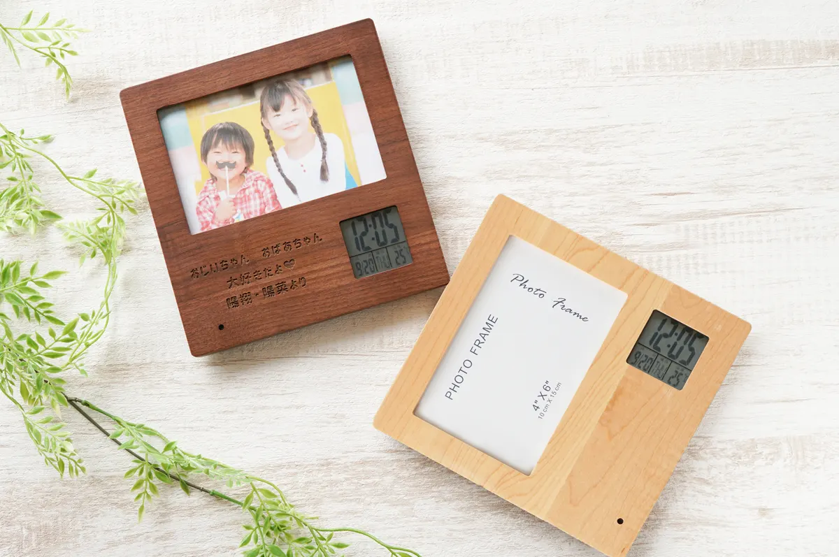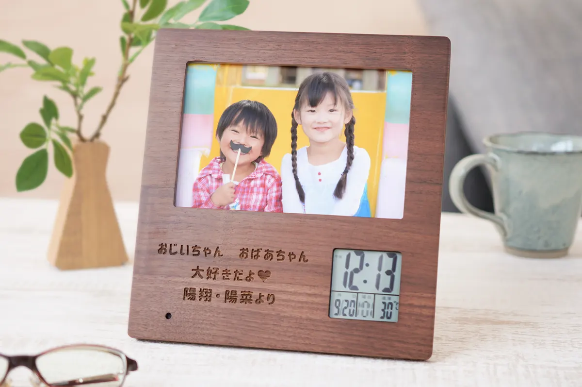 デジタル表示で見やすい名入れフォトフレームクロック。木製ならではのぬくもりが温かい空間を作り出します。