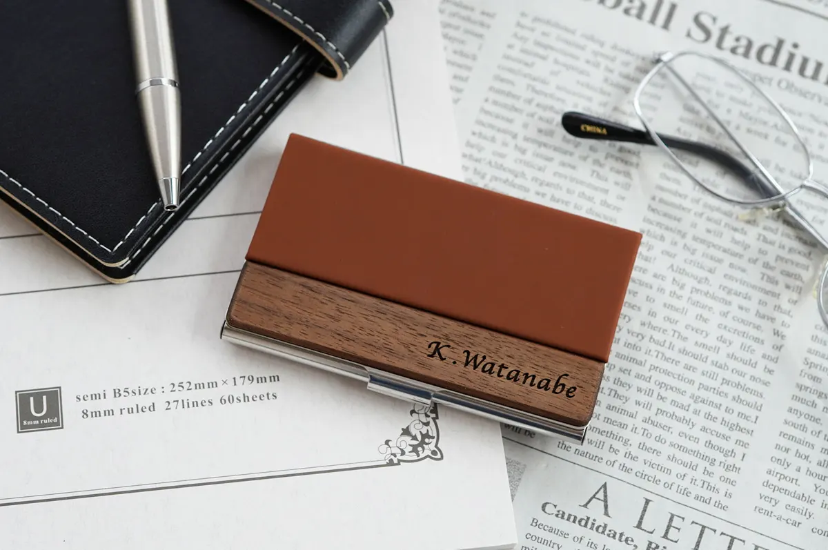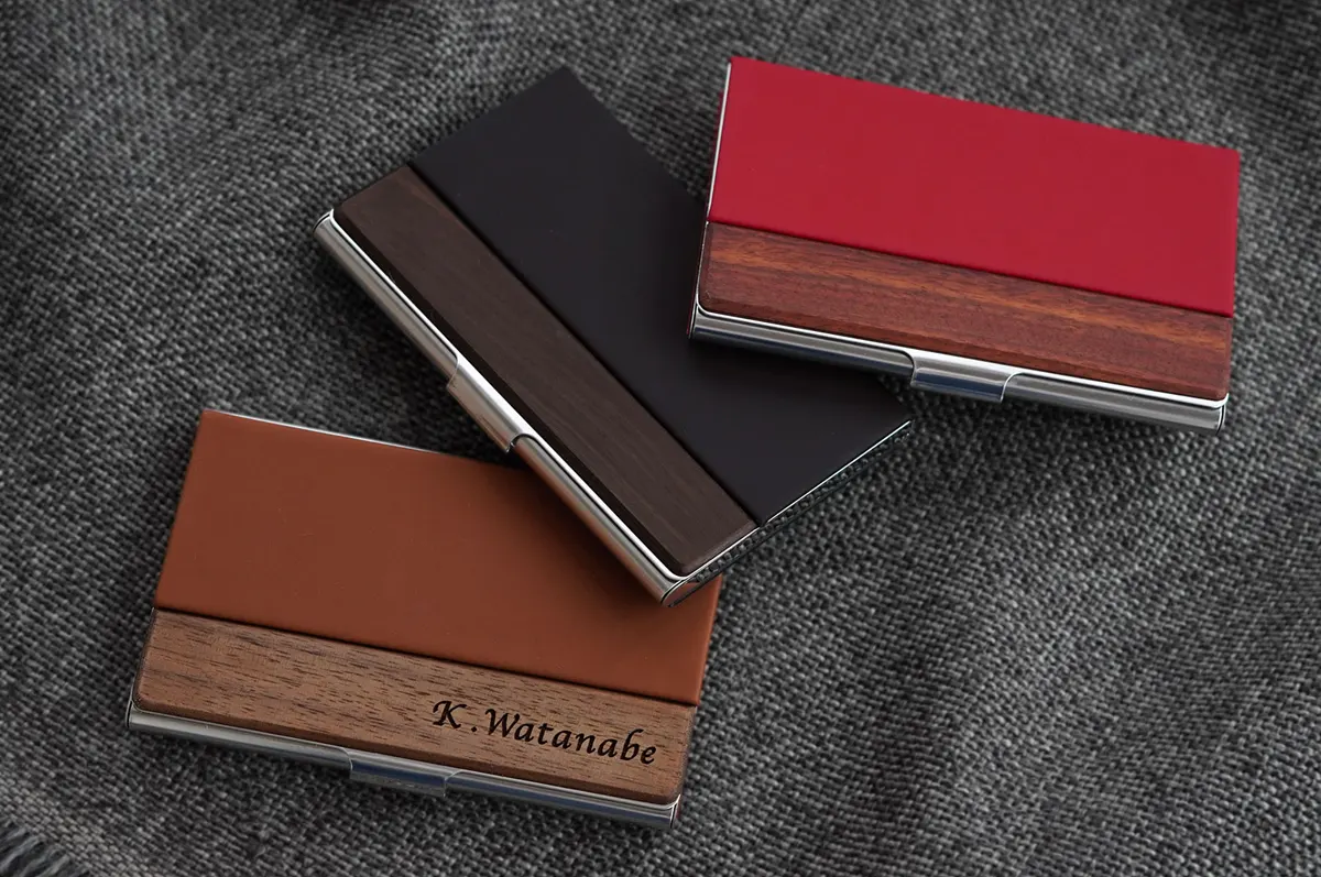 天然木×PUの異素材で作られた名入れ名刺入れ。シンプルで派手すぎないものの、一味違った個性的なデザインが贈り物に大人気です。