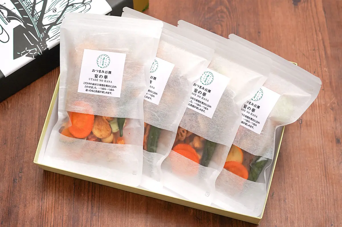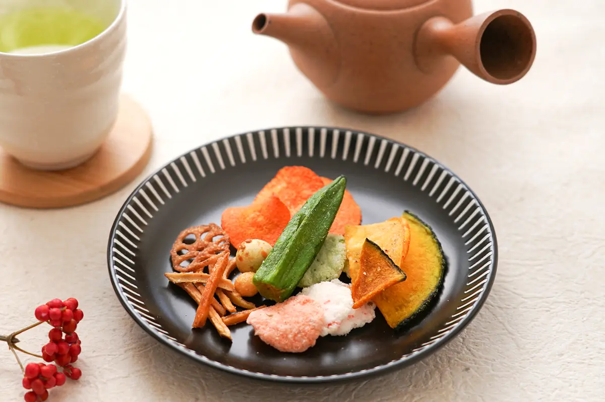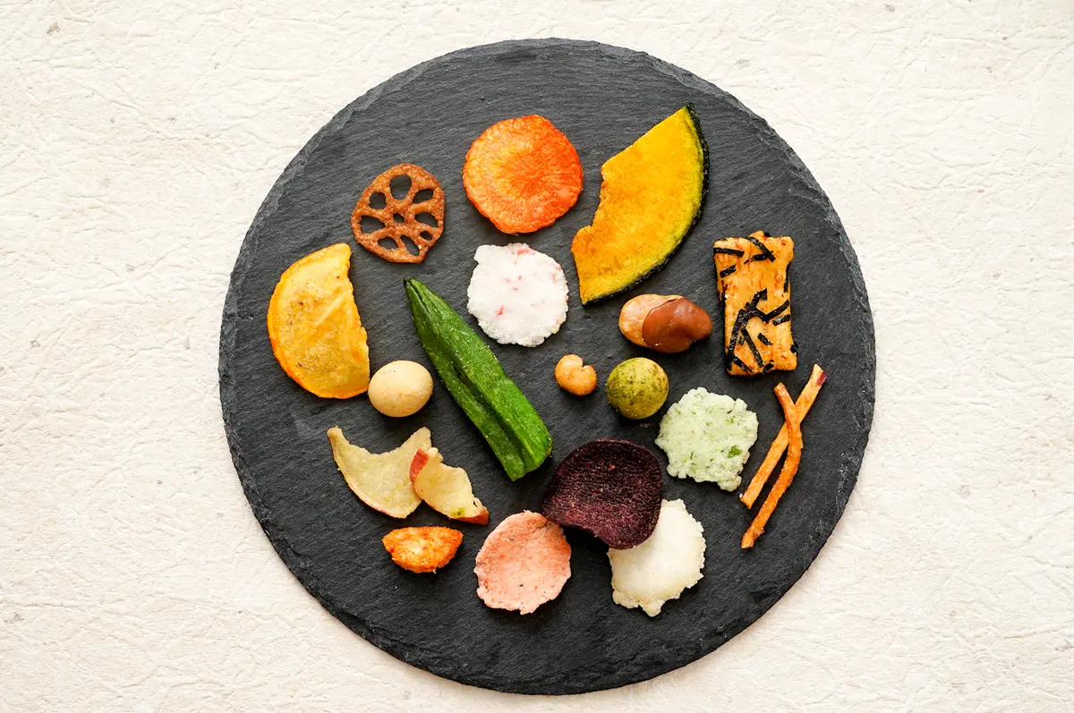 こだわりの野菜や果物など21種の素材を詰め合わせたふきよせ菓子。「減圧フライ製法」により、ビタミンやミネラルなどの栄養素をキープしつつ旨味もしっかり感じられます。