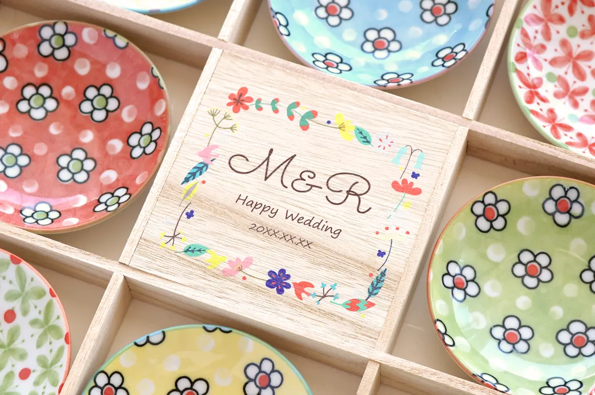 手のひらサイズの可愛いお皿を8枚も詰め込んだ、名入れ北欧豆皿セット。「円満」を意味する丸皿は、結婚祝いのギフトにぴったりです。