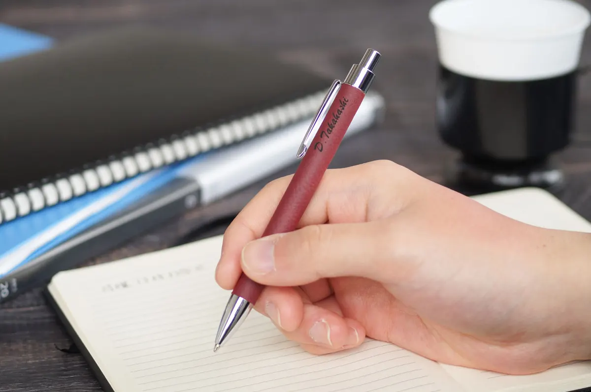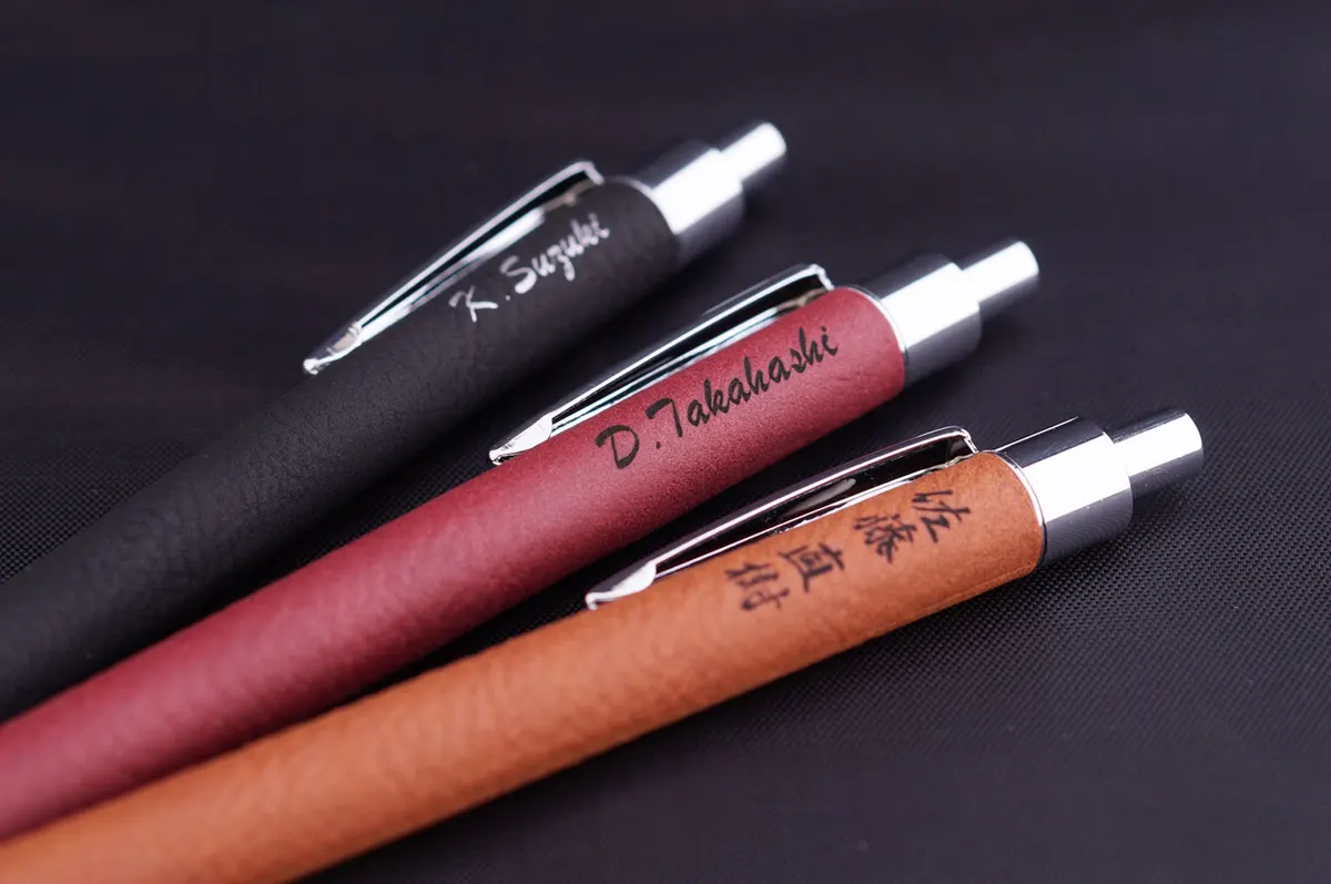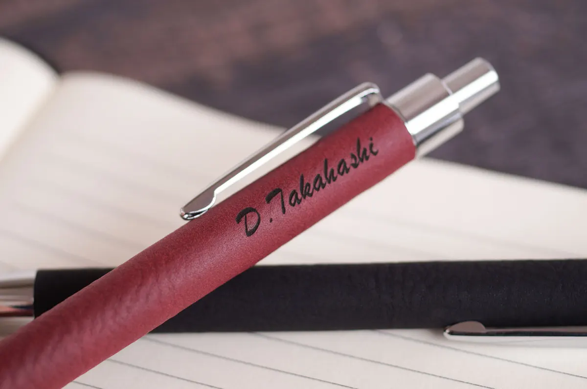 しっとりした肌触りが特徴的な名入れレザーボールペン。アメリカで開発された、耐水性・耐久性に優れた合皮素材『シンセティックレザー』を使用しています。