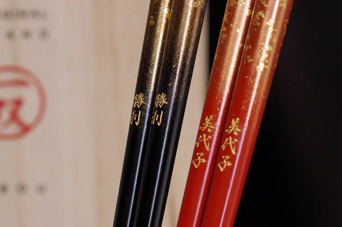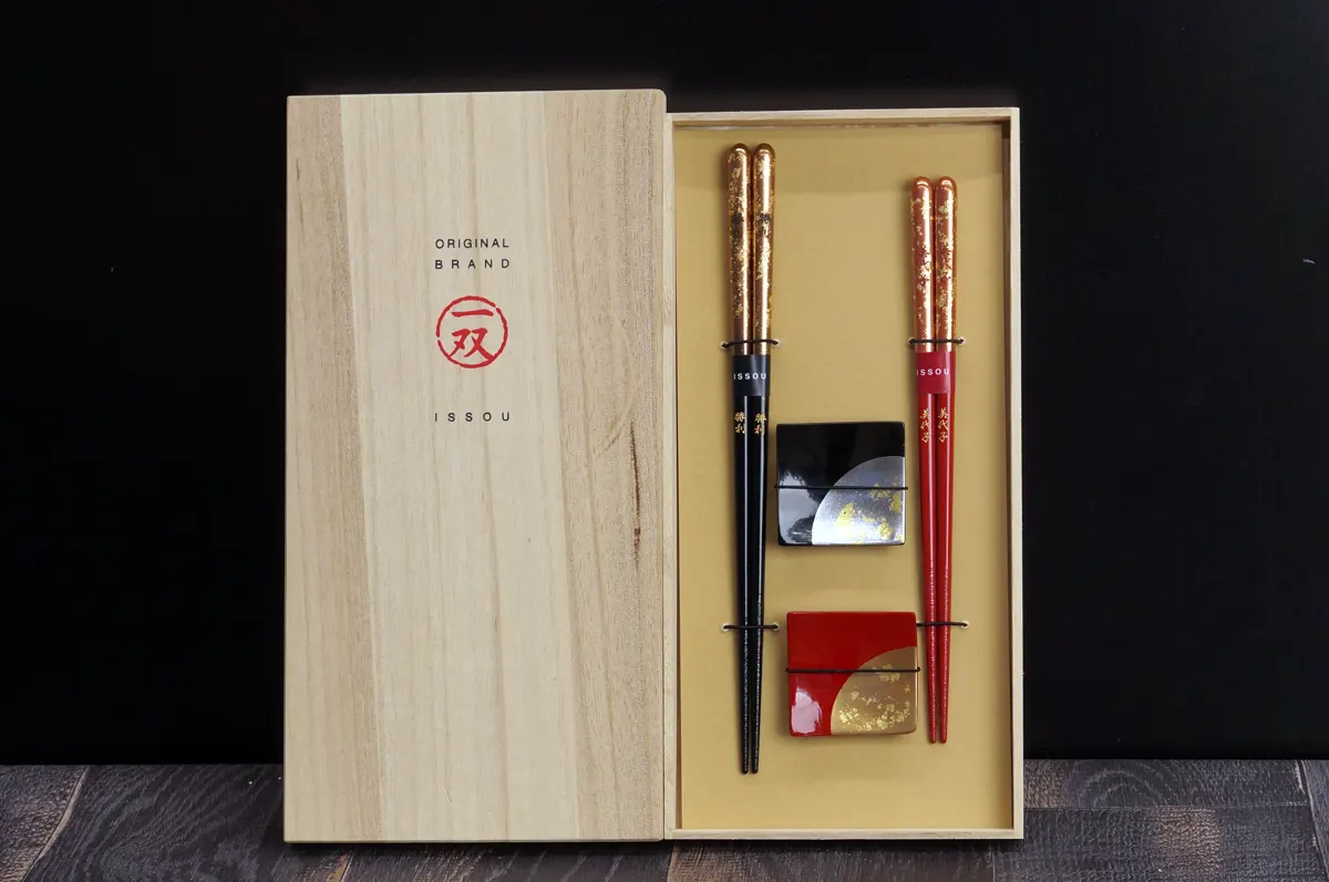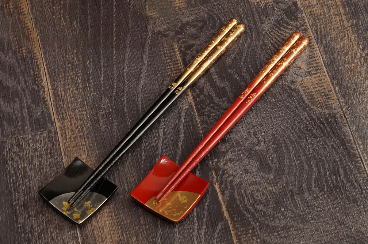 贅沢に散りばめられた金箔が食卓を彩る、名入れ瑞雲箔散らし箸&箸置き4点セット。手のひらに感じる金箔の繊細な凹凸の味わいと存在感がクセになる逸品です。